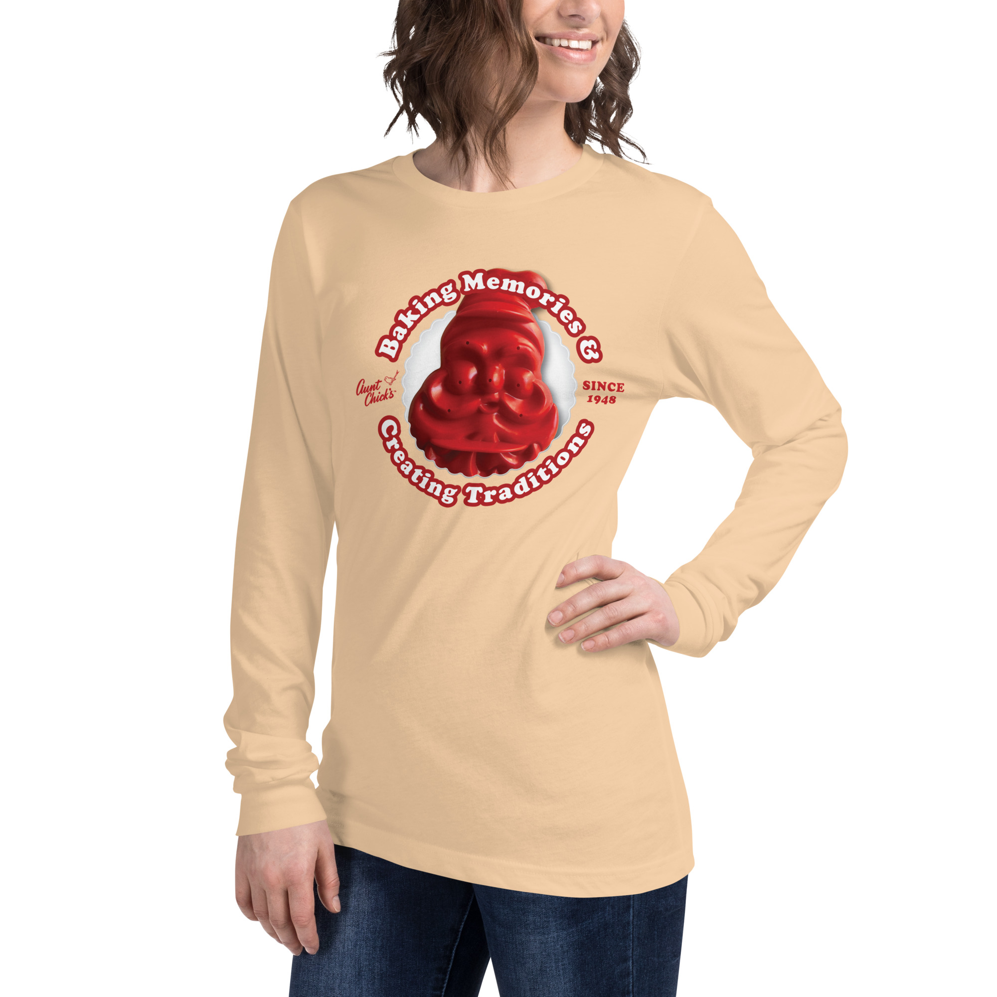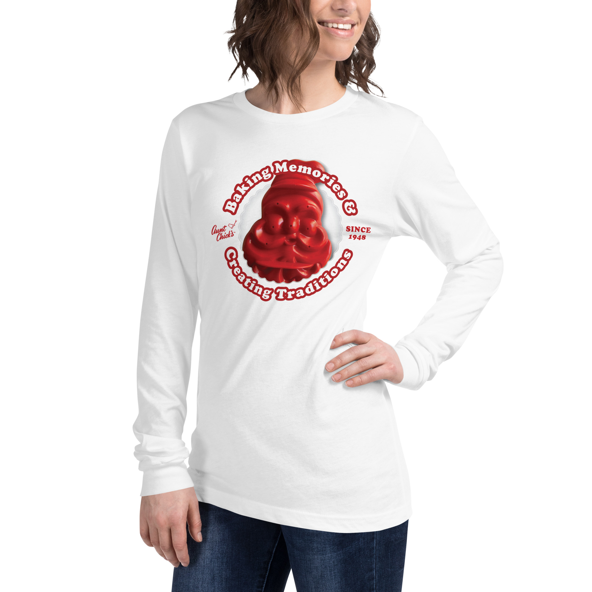 Introducing our Unisex Long-Sleeve Crew Neck T-shirt, meticulously crafted from 100% cotton and adorned with the timeless charm of Aunt Chick’s™ Jolly Santa Cutter. Originally released to market in 1948, this iconic design captures the essence of holiday baking traditions that have warmed hearts for generations. Embrace both comfort and nostalgia with this premium long-sleeve tee, perfect for chilly days and festive gatherings alike. Complete with the cherished slogan “Aunt Chick’s™ Baking Memories & Creating Traditions Since 1948,” it’s more than just apparel—it’s a celebration of cherished memories and the enduring joy of homemade treats. Whether you’re mixing up batches of cookies or simply spreading holiday cheer, this long-sleeve tee is a cozy companion for all your seasonal adventures.