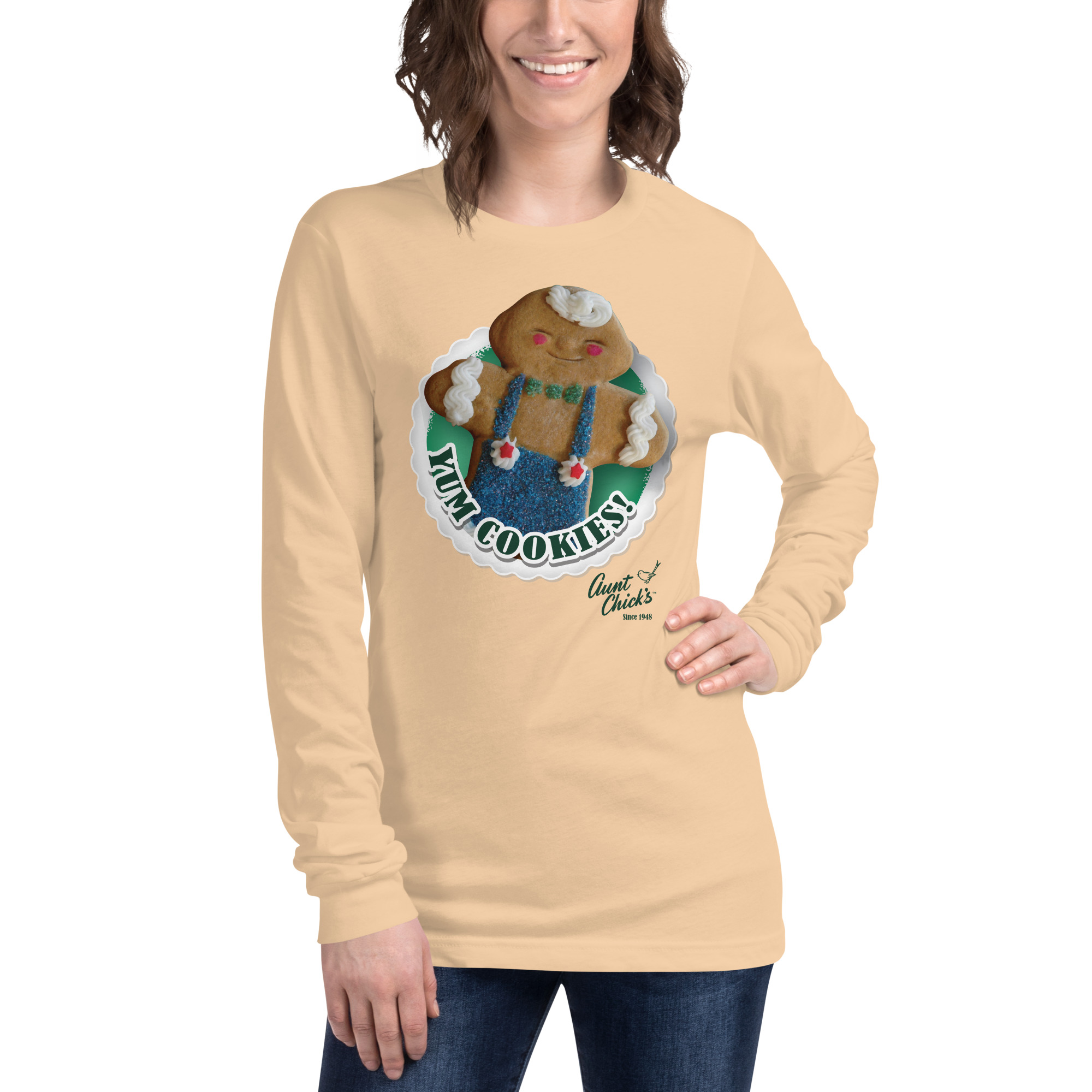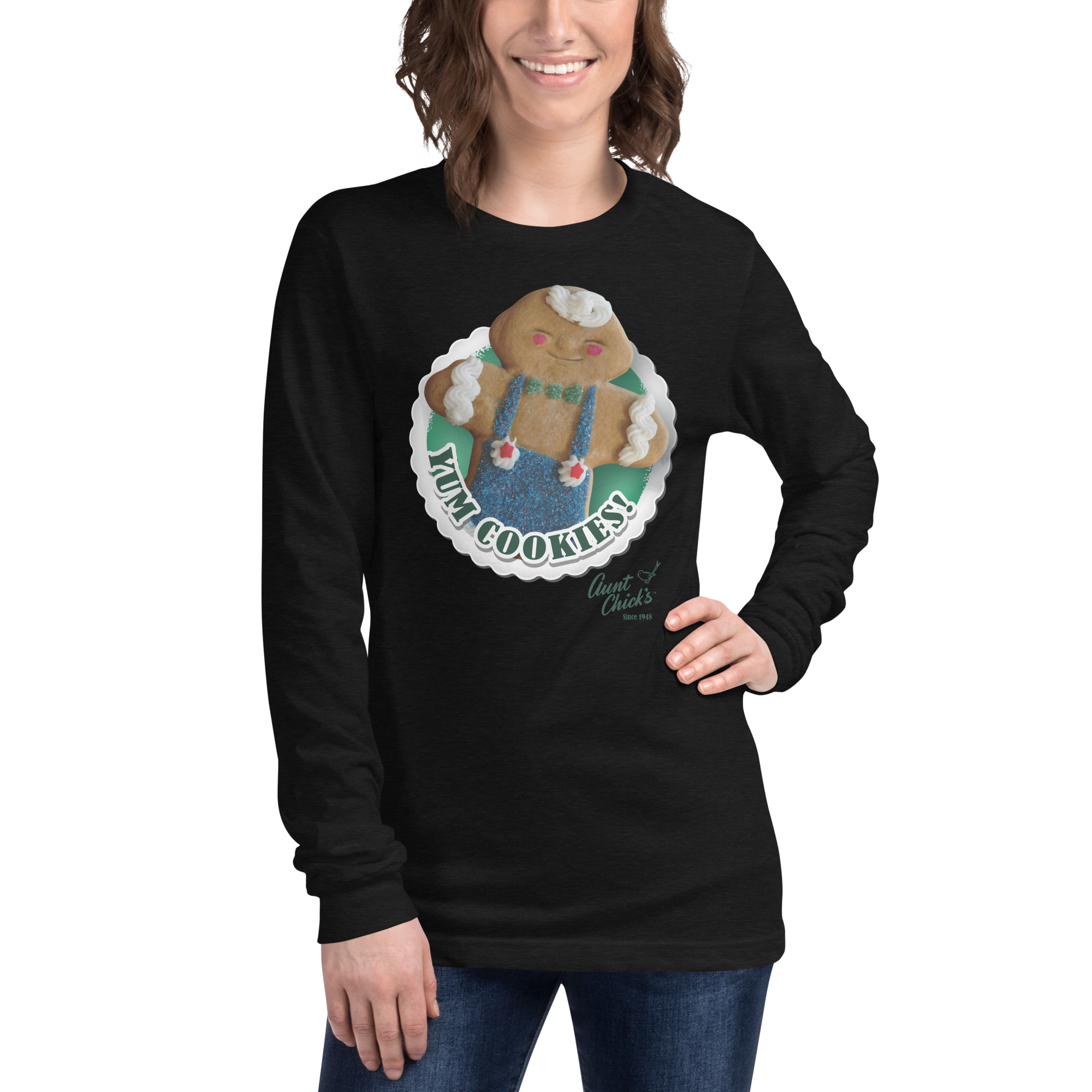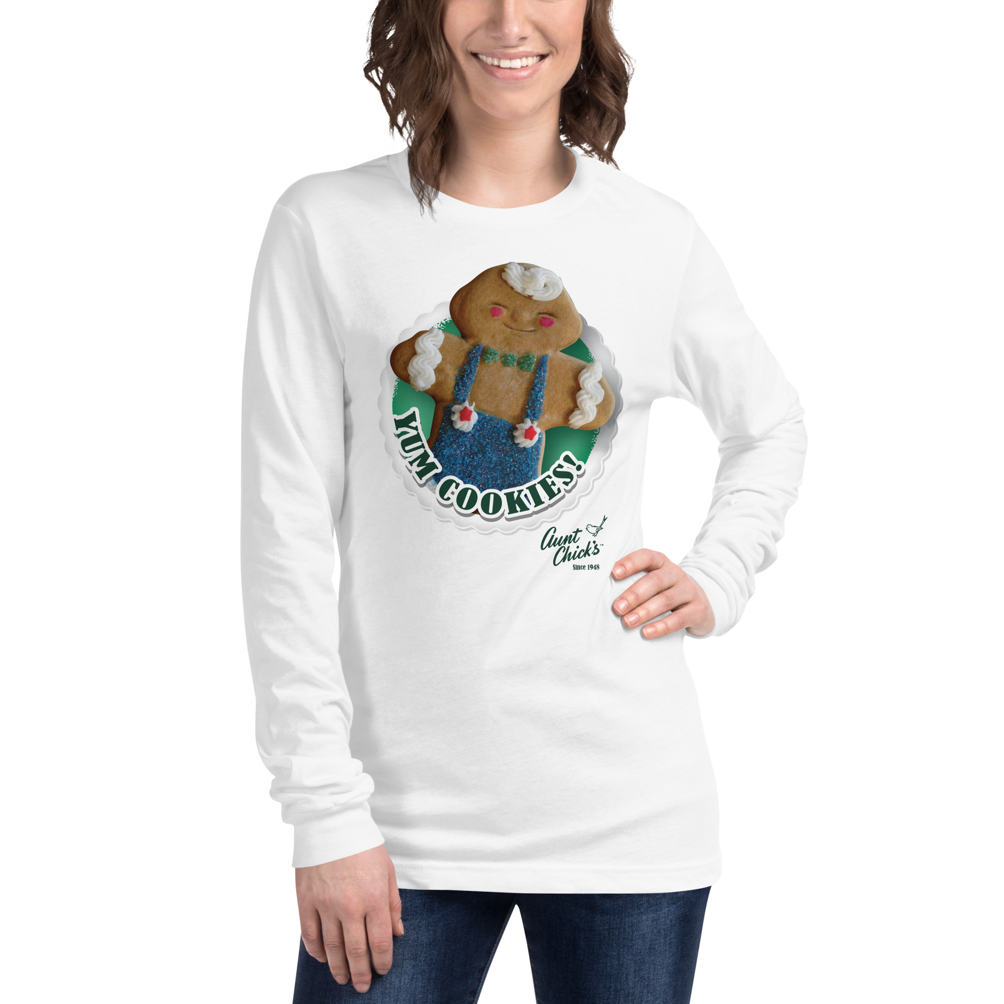 Introducing our Unisex Long-Sleeve Crew Neck T-shirt, meticulously crafted from 100% cotton and adorned with the timeless charm of Aunt Chick’s™ Gingerbread Man Cookie.