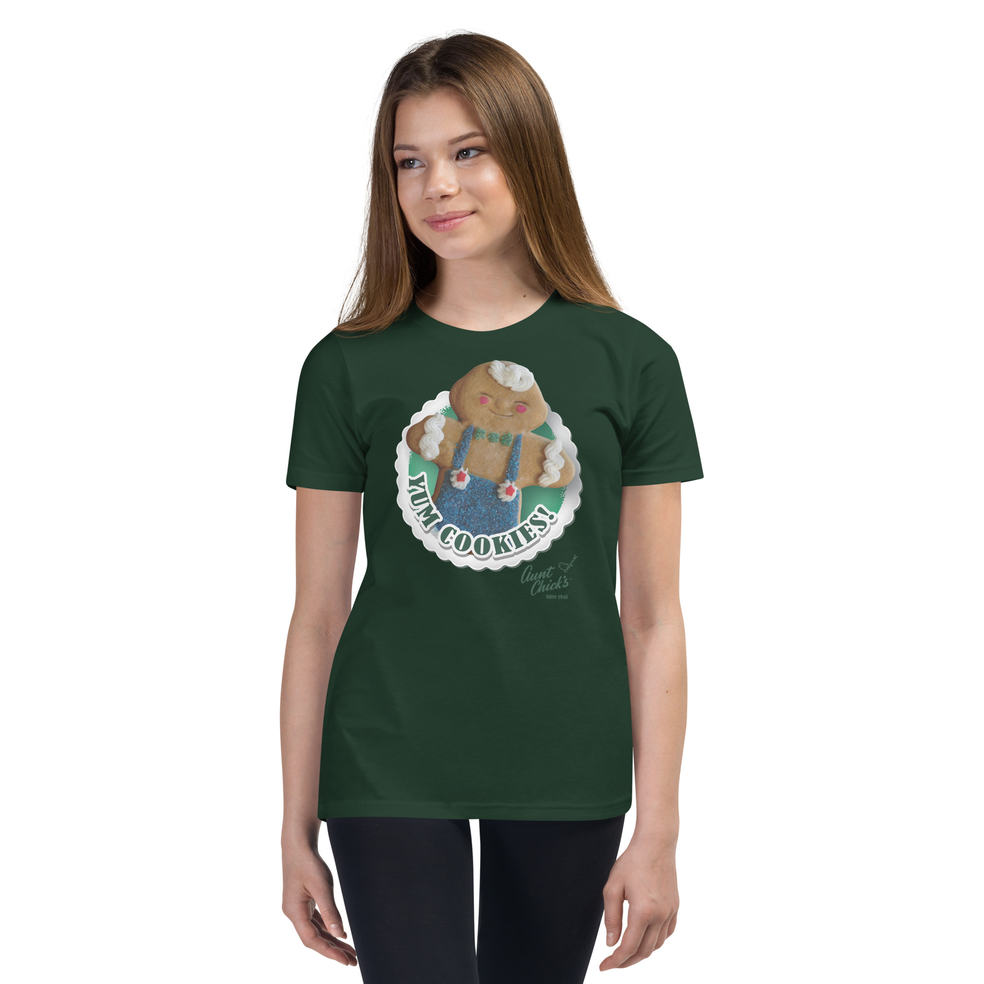 Introducing our Youth Short Sleeve Crew Neck T-shirt, meticulously crafted from 100% cotton and adorned with the timeless charm of Aunt Chick’s™ Gingerbread Man Cookie.