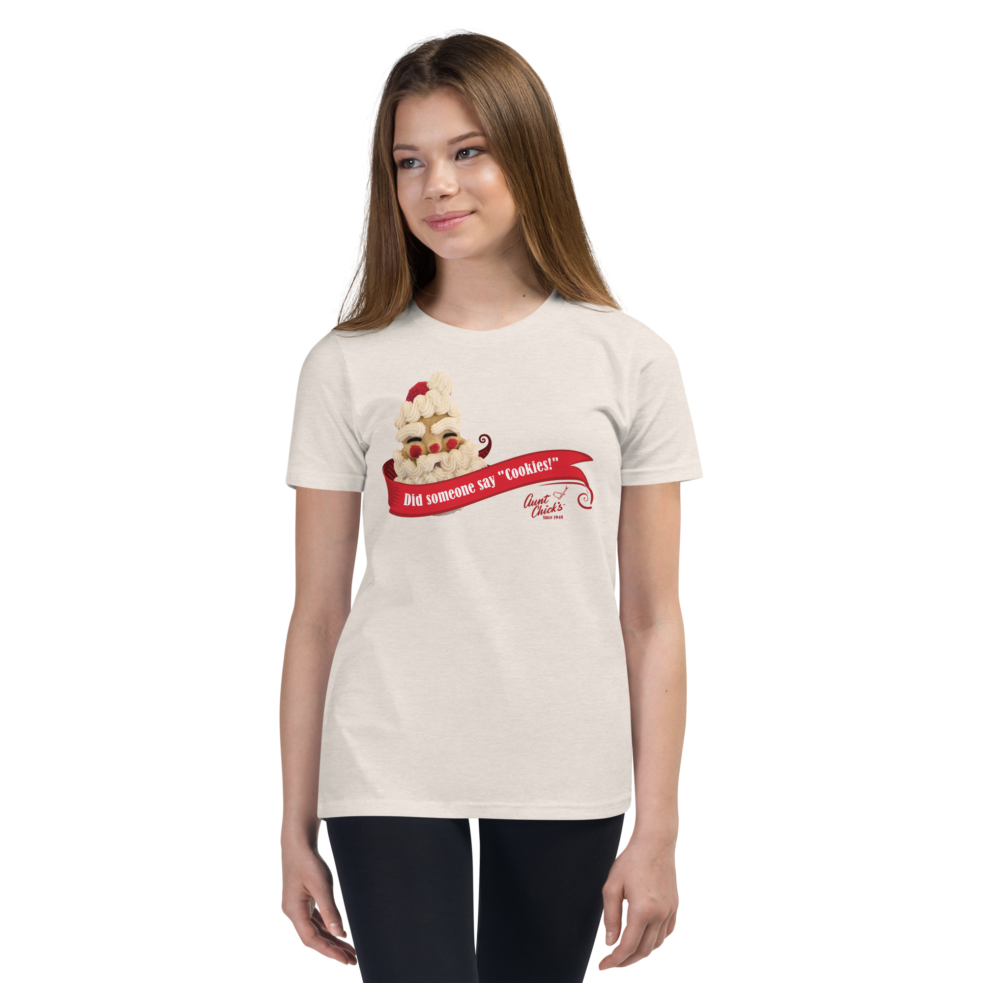 Introducing our Aunt Chick’s™ Jolly Santa Cookie Youth Short Sleeve T-Shirt, a delightful blend of festive charm and youthful comfort. Adorned with the iconic Santa cookie design, meticulously crafted using the original Aunt Chick’s™ Jolly Santa Cookie Cutter, this tee brings holiday magic to life. With the cheerful words “Did someone say Cookies!” emblazoned beneath, it exudes merry spirit and joyful anticipation. Made from soft and breathable cotton, this t-shirt ensures comfort for all-day play or holiday adventures. Let your young one spread cheer and excitement with every wear, celebrating the season in style with this adorable tee that captures the essence of timeless traditions.
