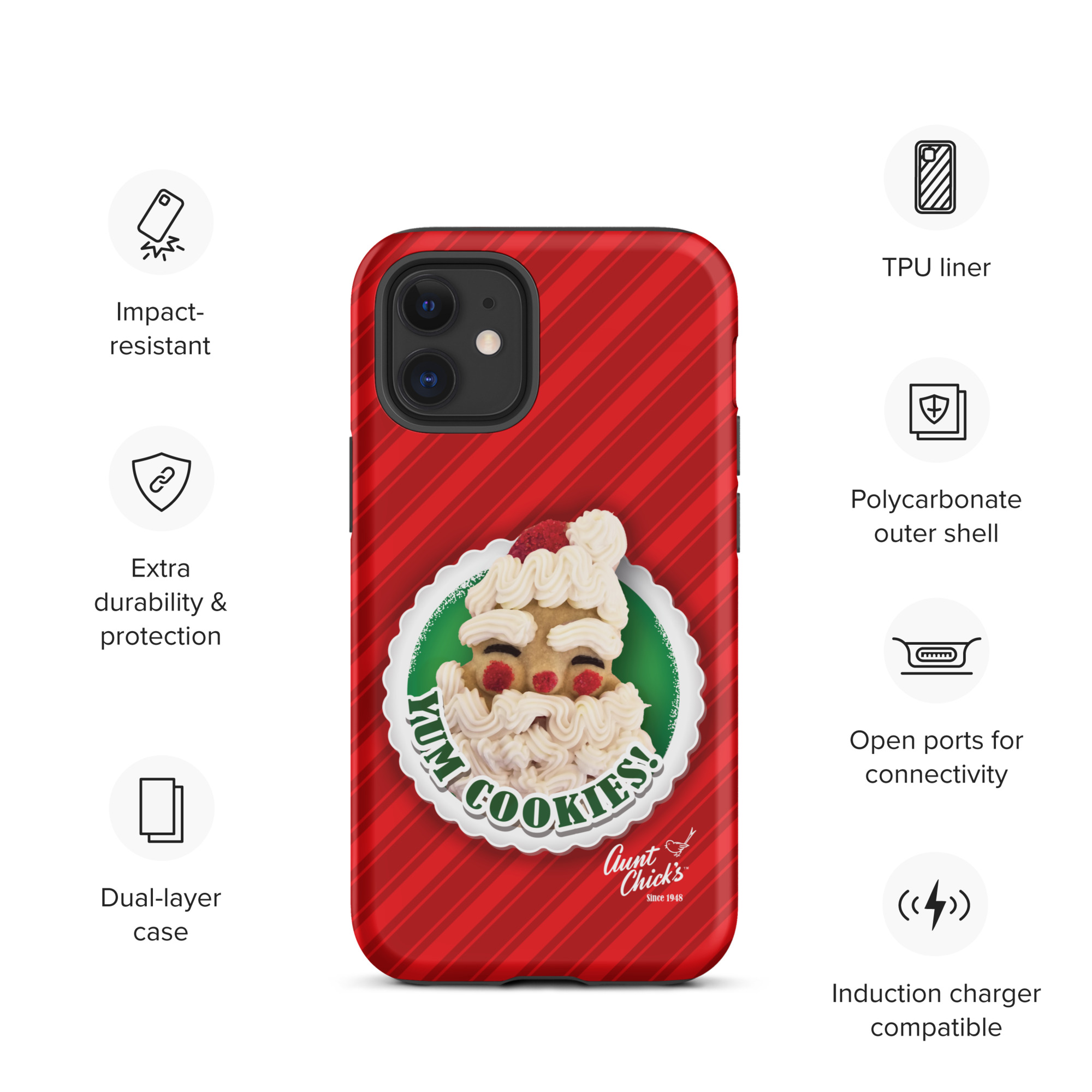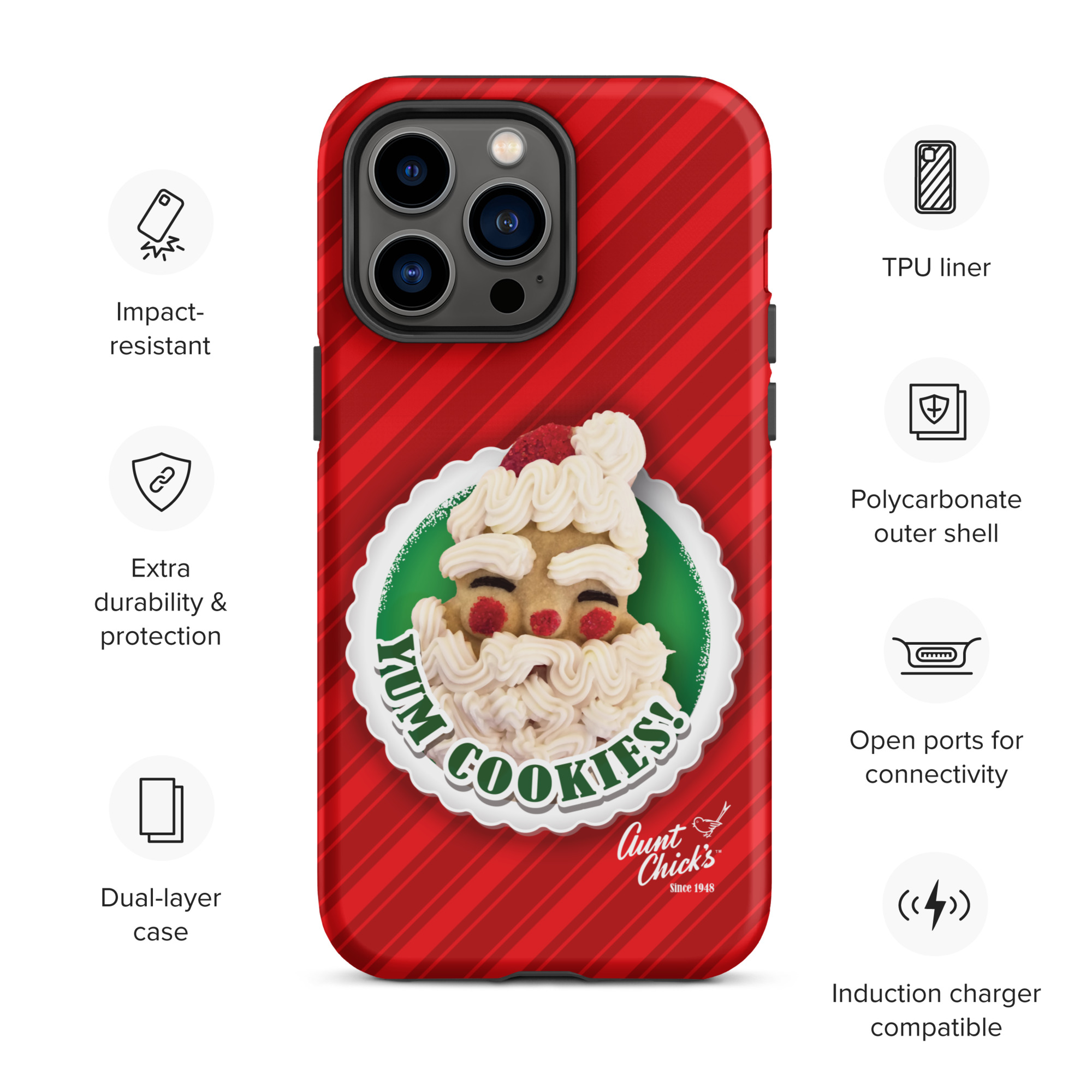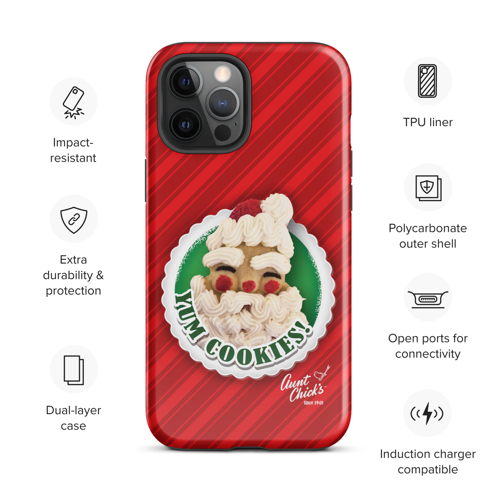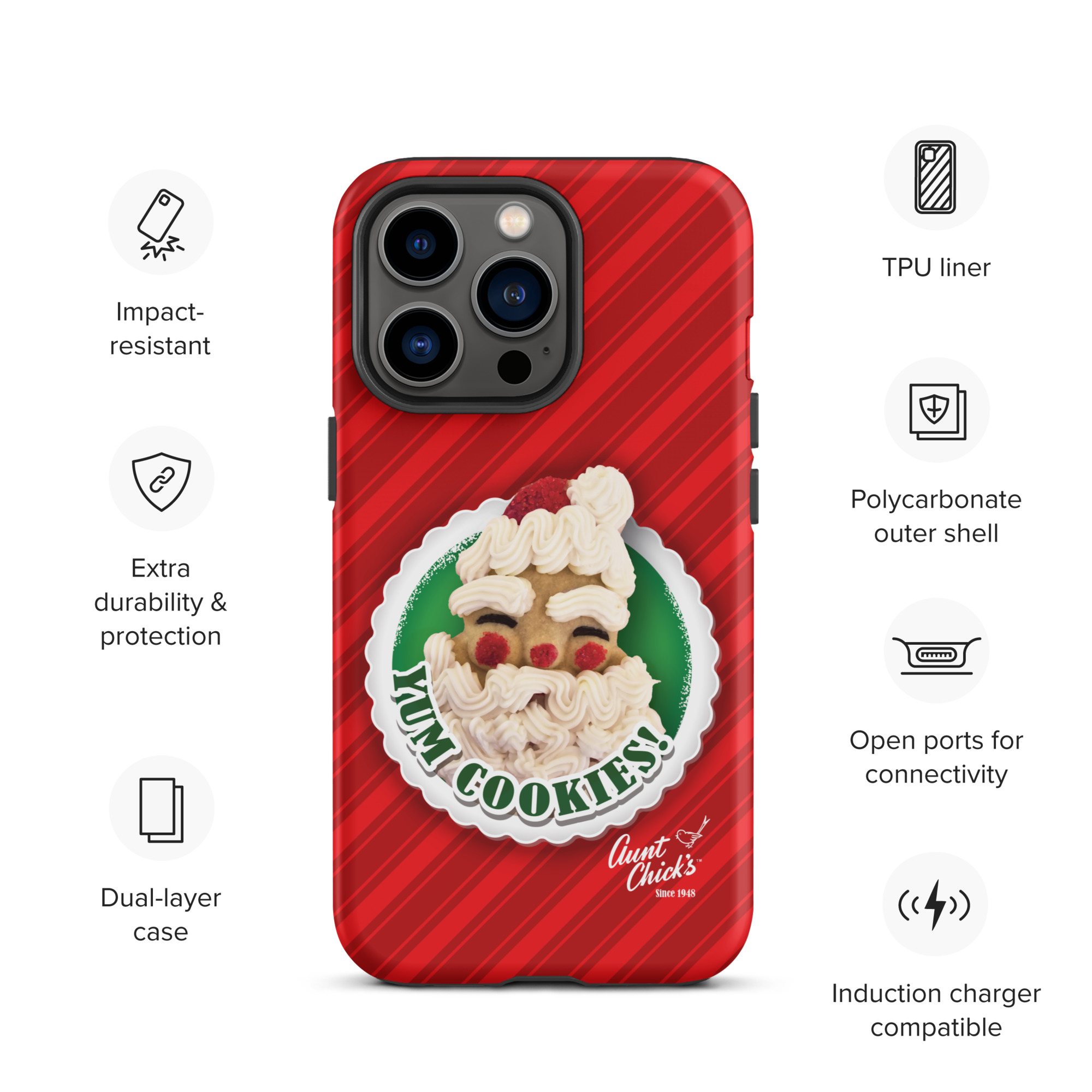 Introducing the iPhone Tough Phone Case adorned with the festive charm of decorated Santa Cookies crafted from Aunt Chick’s™Jolly Santa Cookie Cutter. Embrace the holiday spirit with words of cheer “YUM COOKIES!” and Aunt Chick’s™ logo woven into a delightful holiday pattern, making every glance at your phone a celebration.