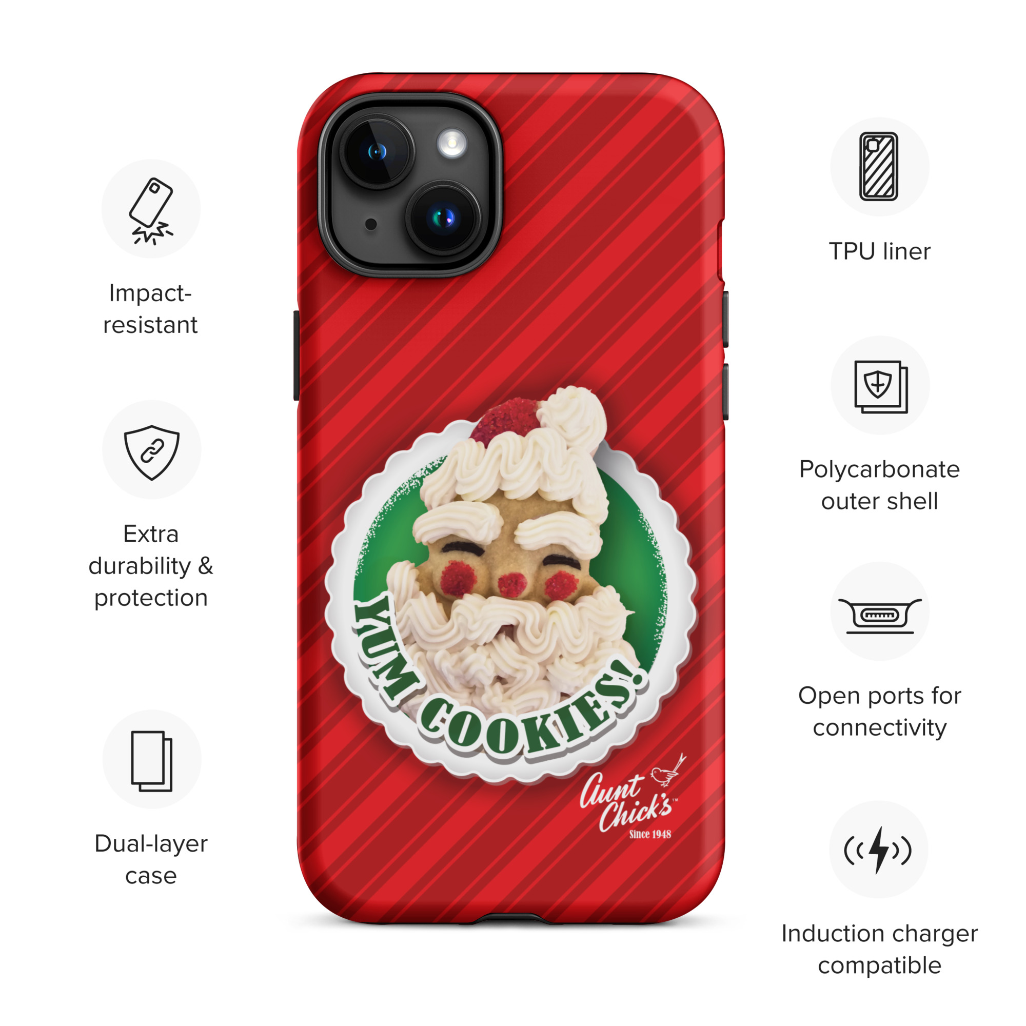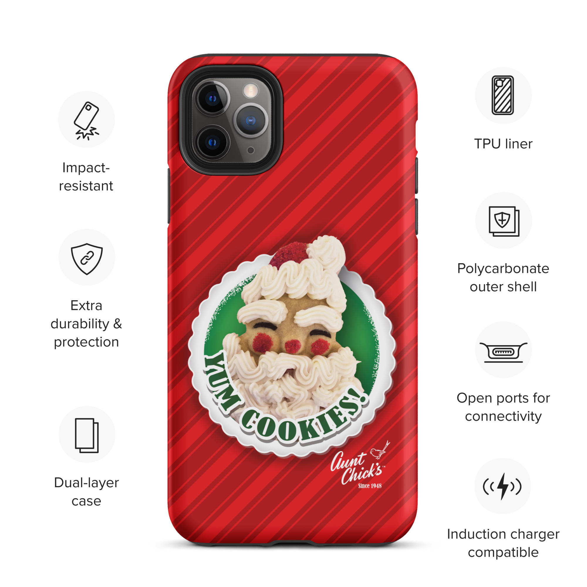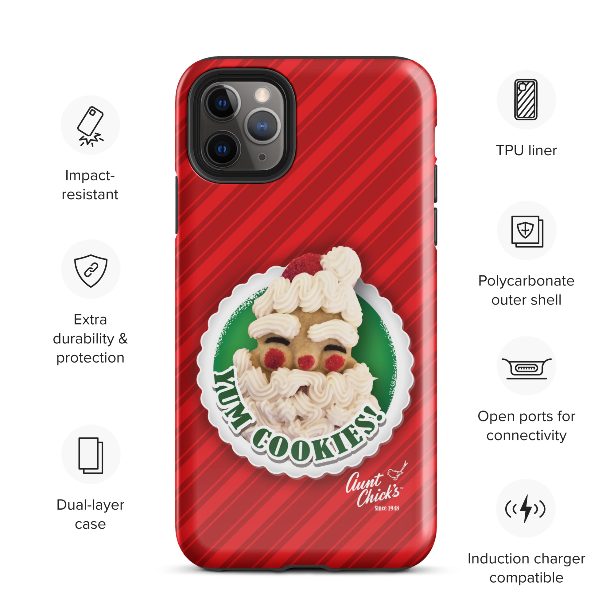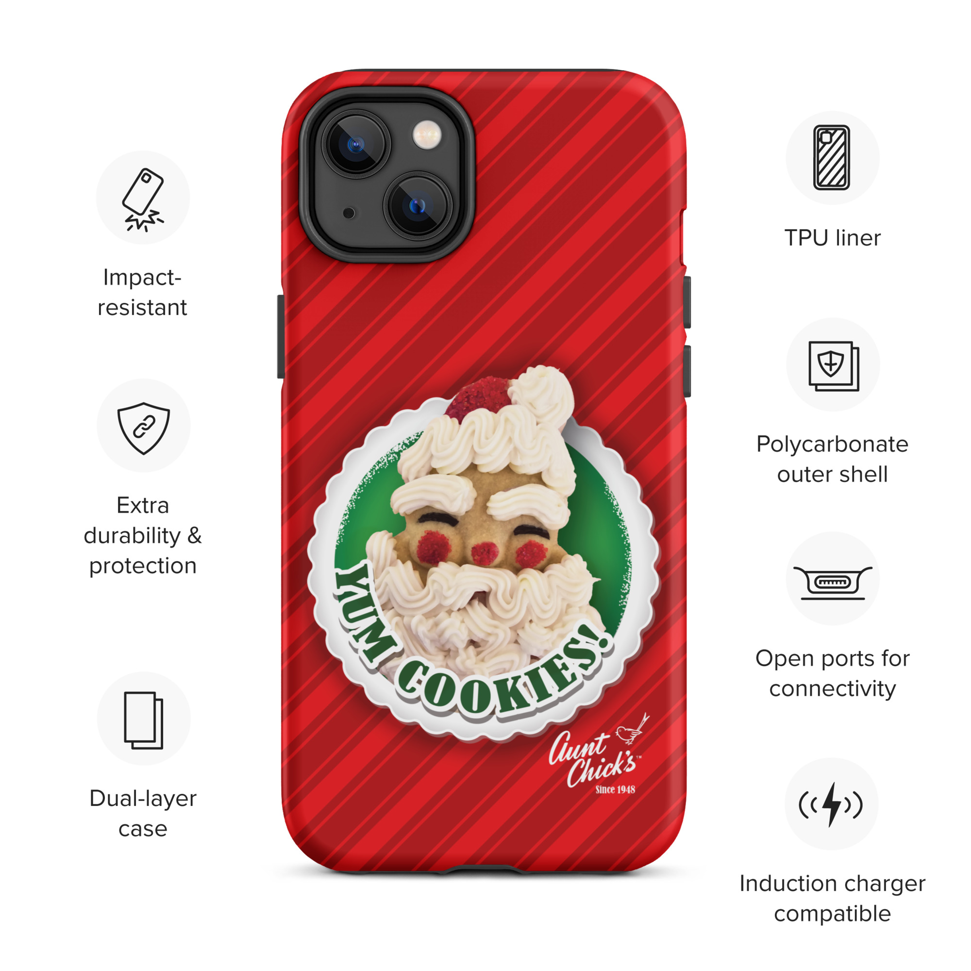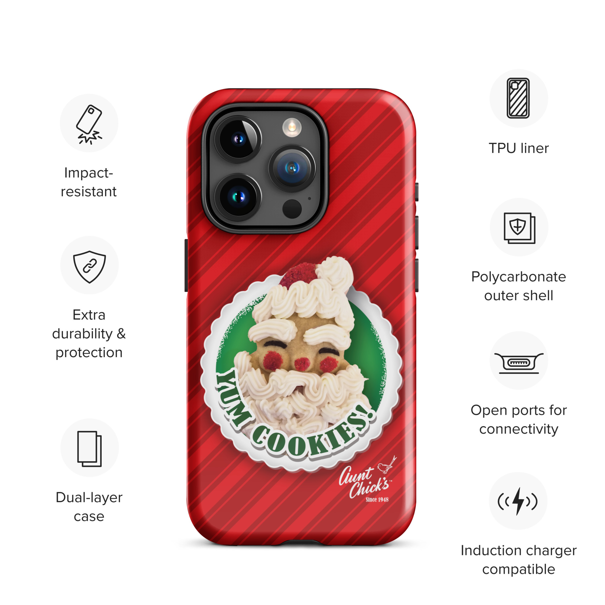 Introducing the iPhone Tough Phone Case adorned with the festive charm of decorated Santa Cookies crafted from Aunt Chick’s™Jolly Santa Cookie Cutter. Embrace the holiday spirit with words of cheer “YUM COOKIES!” and Aunt Chick’s™ logo woven into a delightful holiday pattern, making every glance at your phone a celebration.