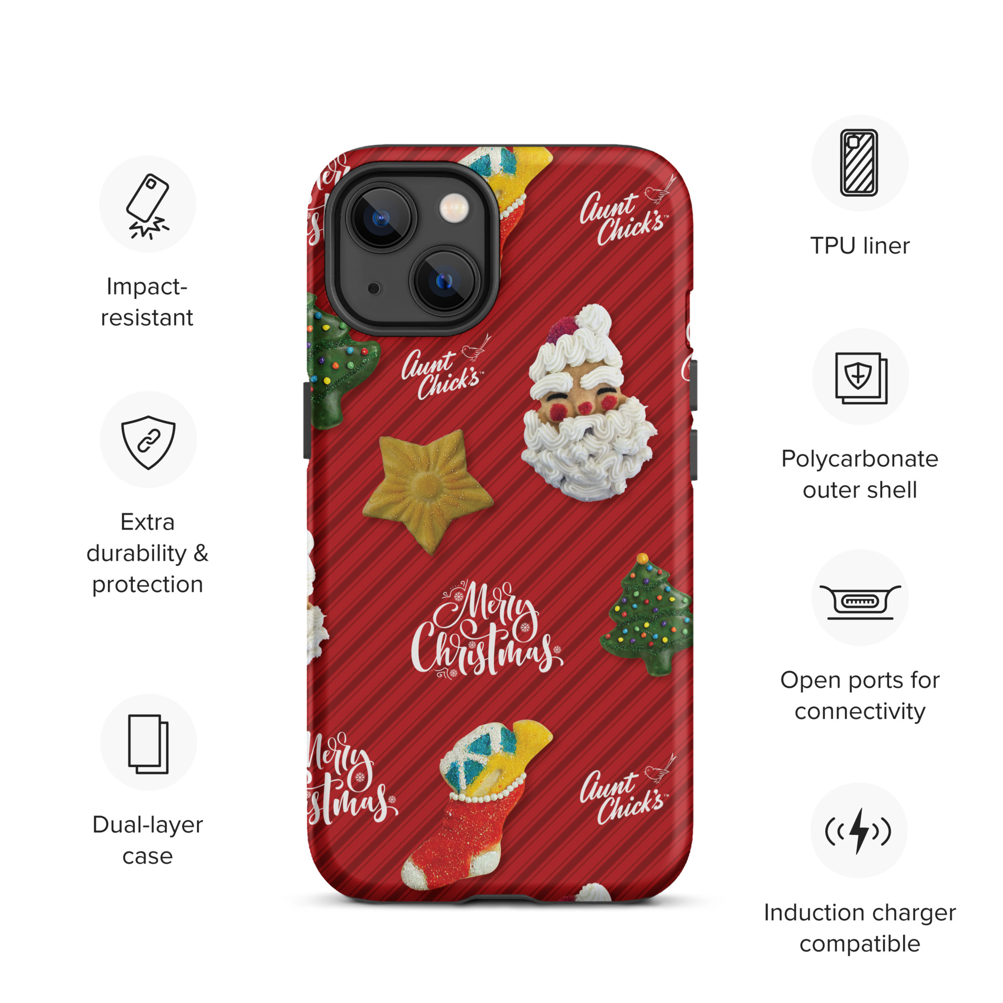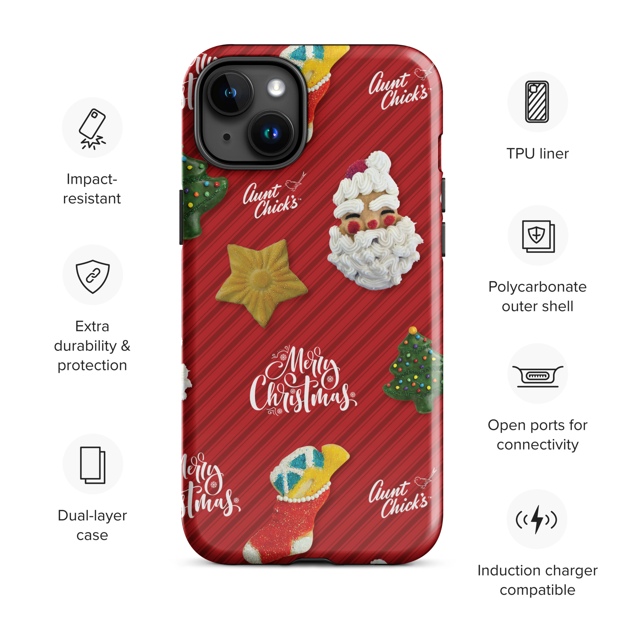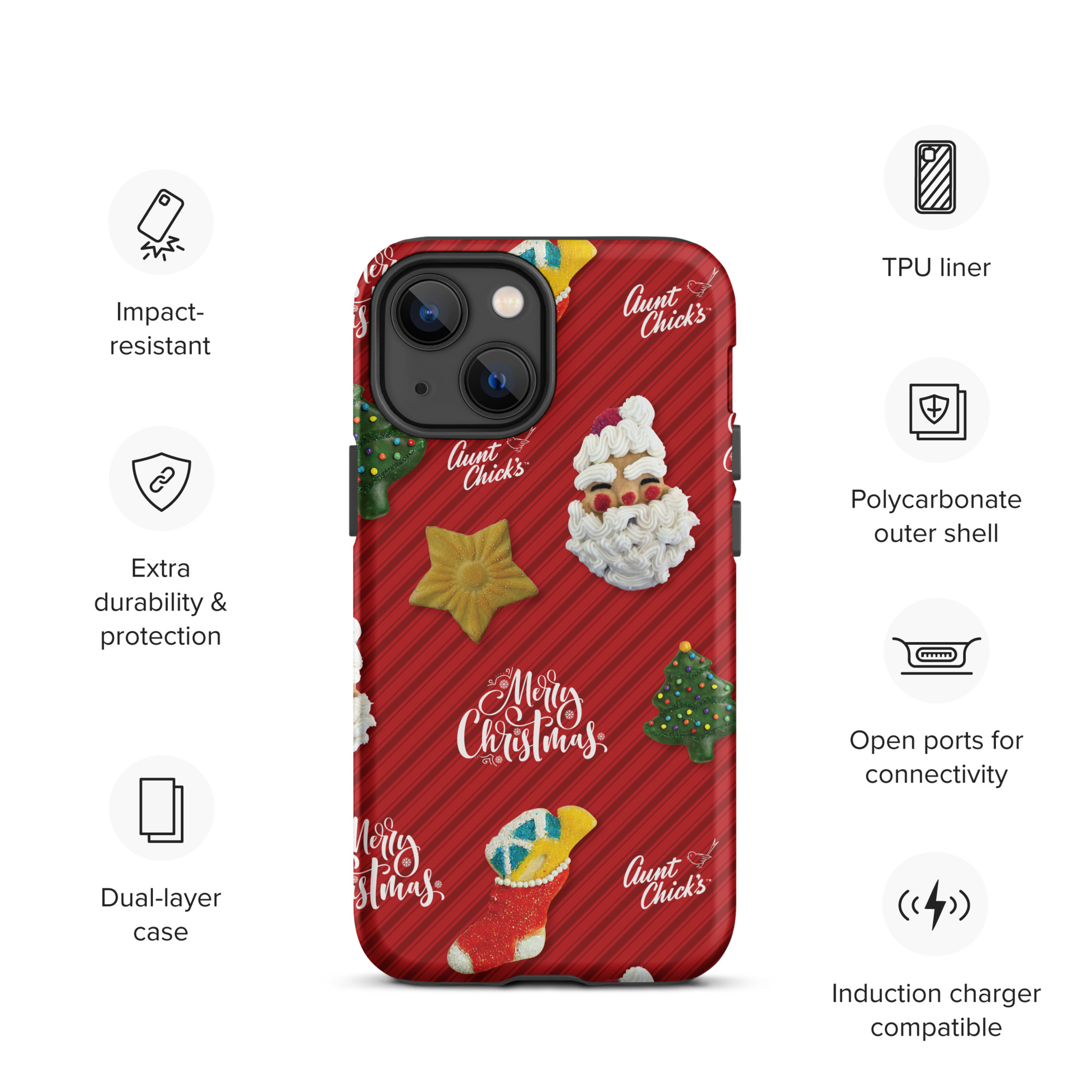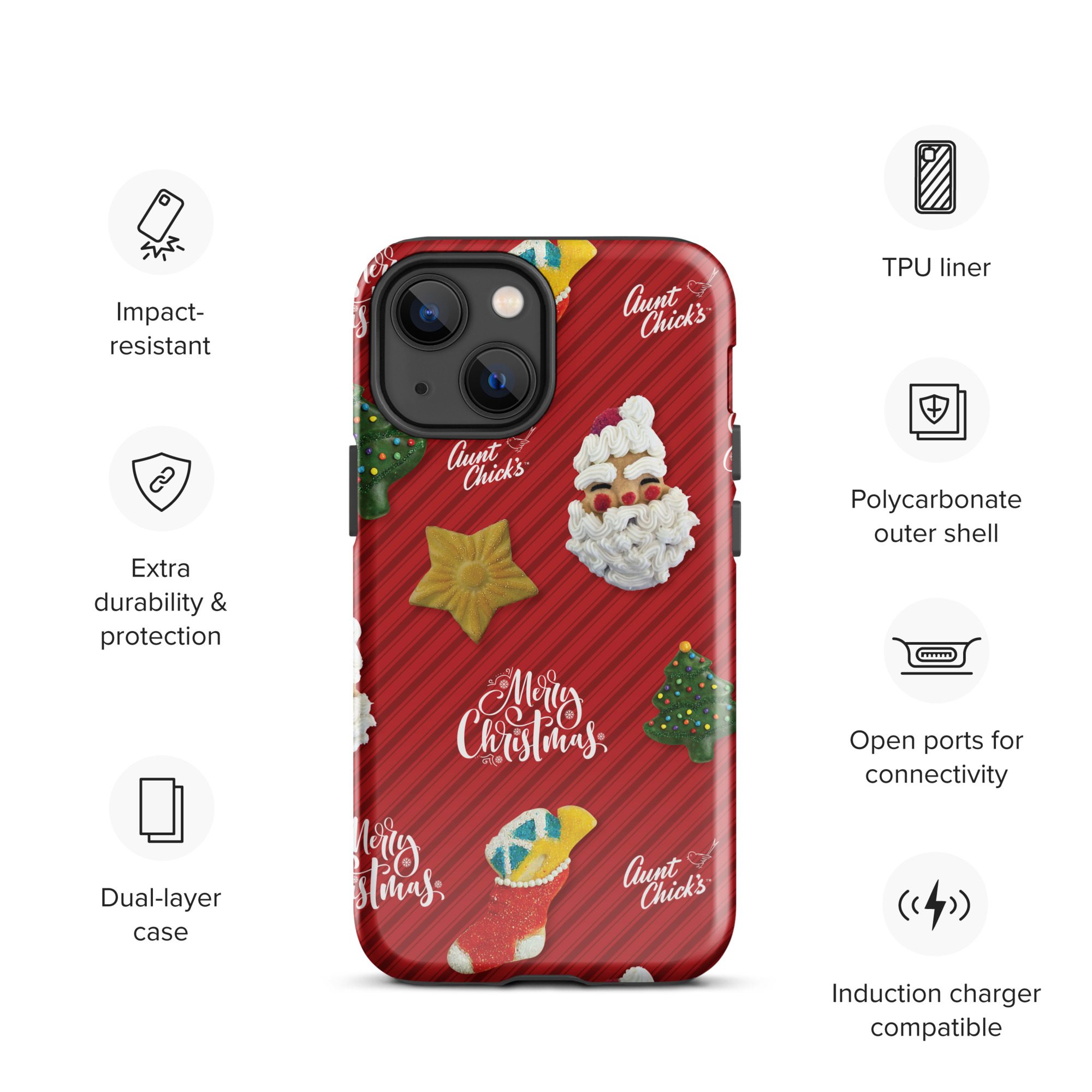 Introducing the iPhone® Tough Phone Case adorned with the festive charm of decorated Cookies crafted from Aunt Chick’s™ Merry Christmas Cookie Cutter Set. Embrace the holiday spirit with words of cheer and Aunt Chick’s™logo woven into a delightful red-striped holiday background, making every glance at your phone a celebration.