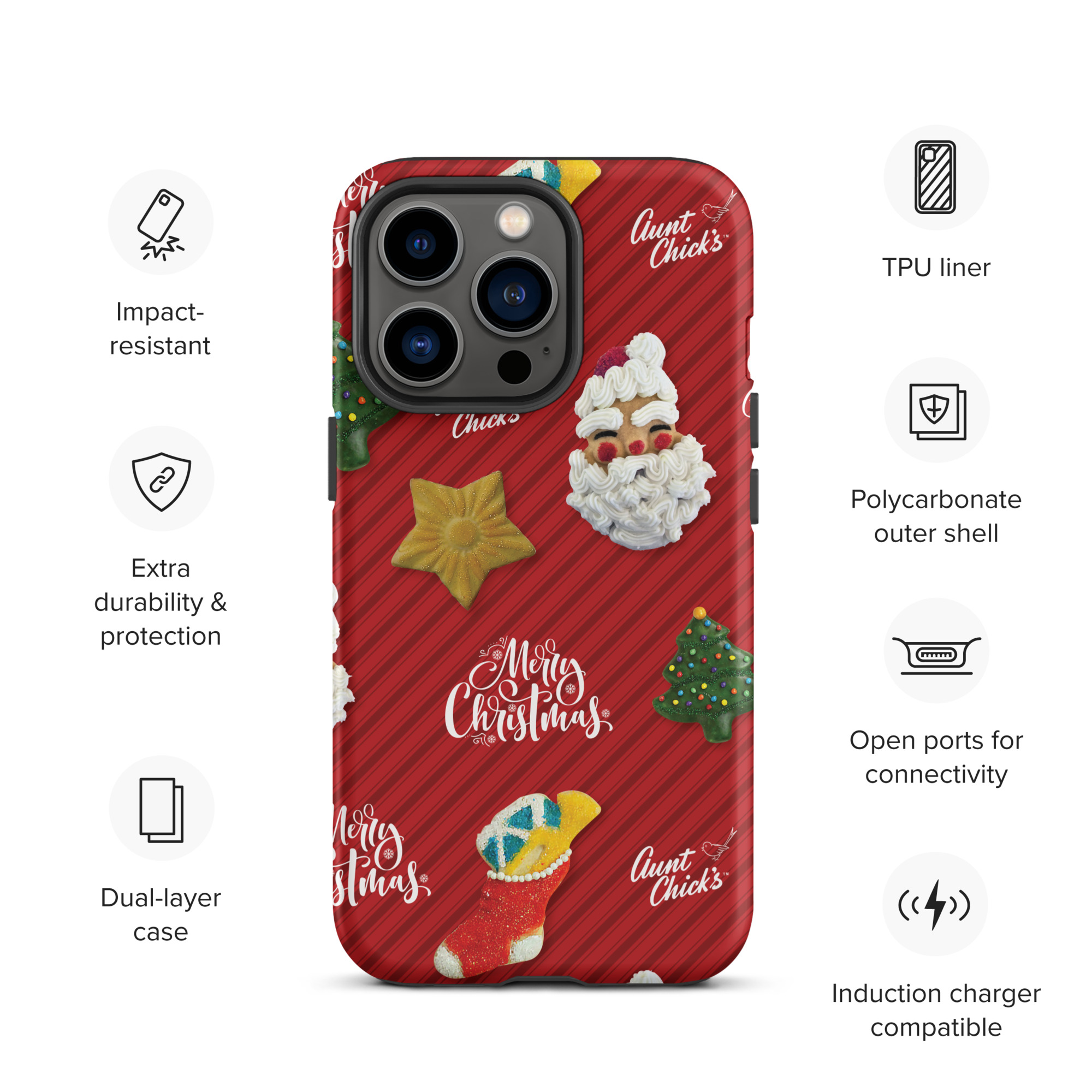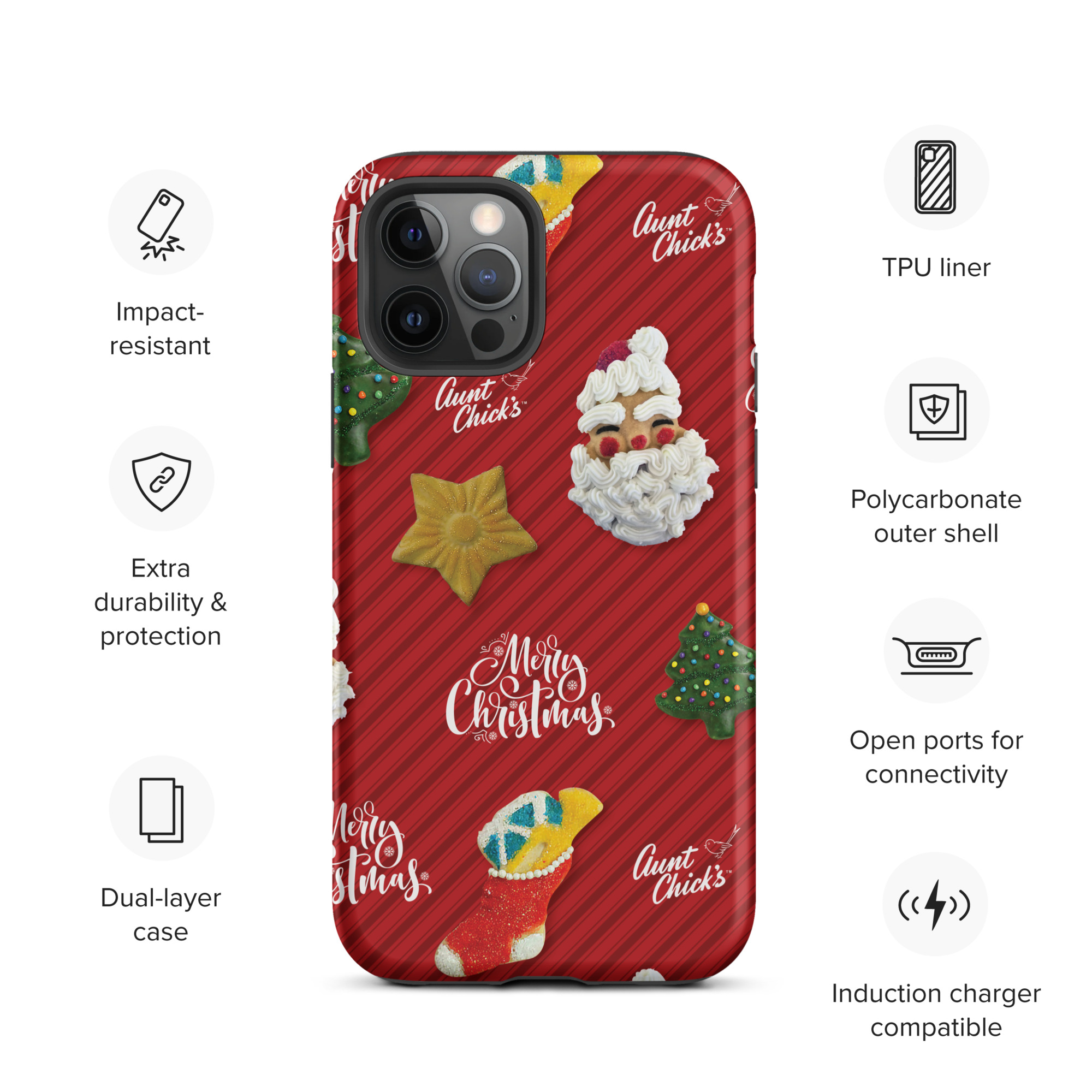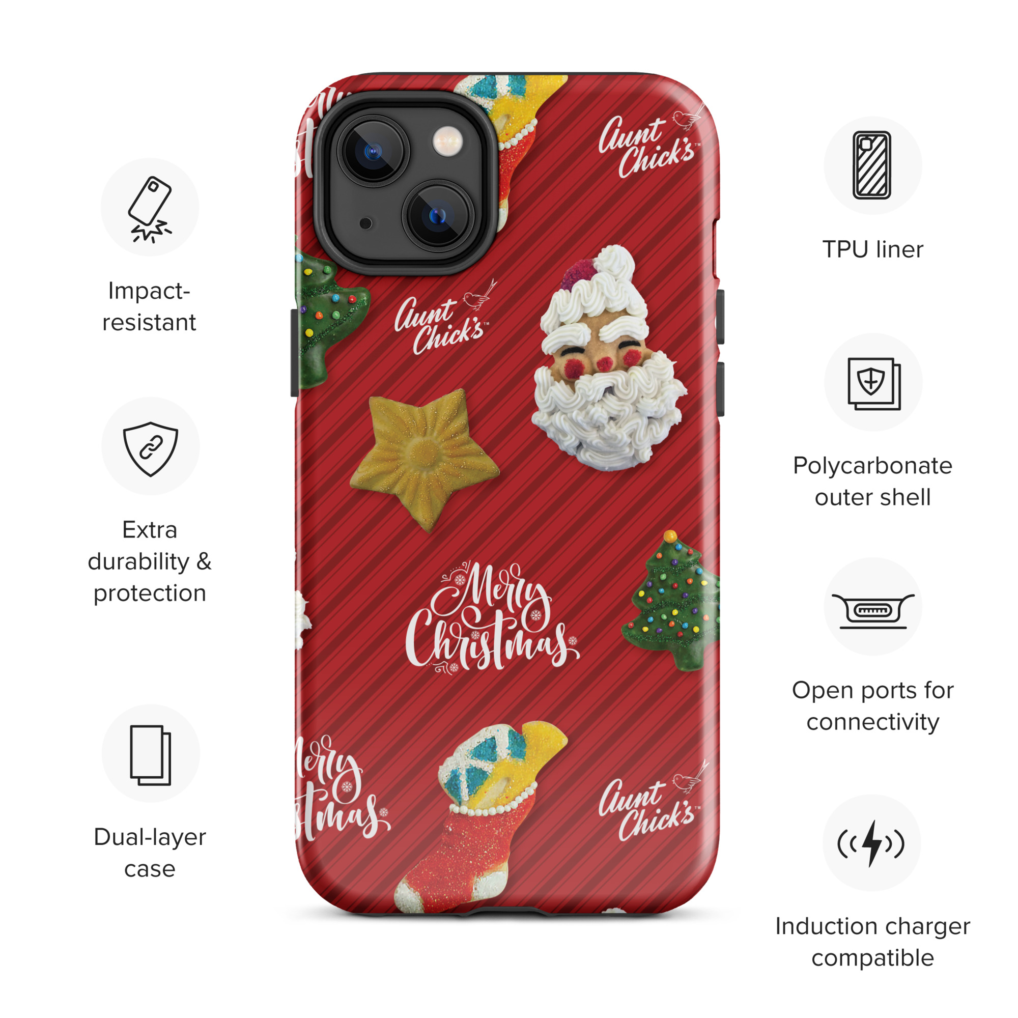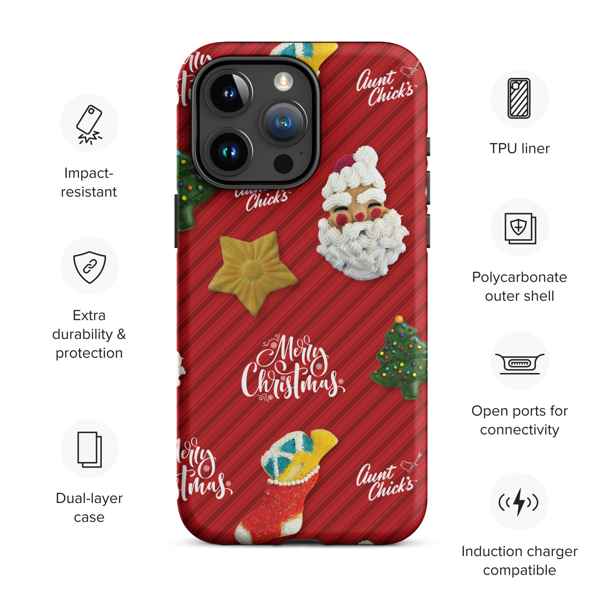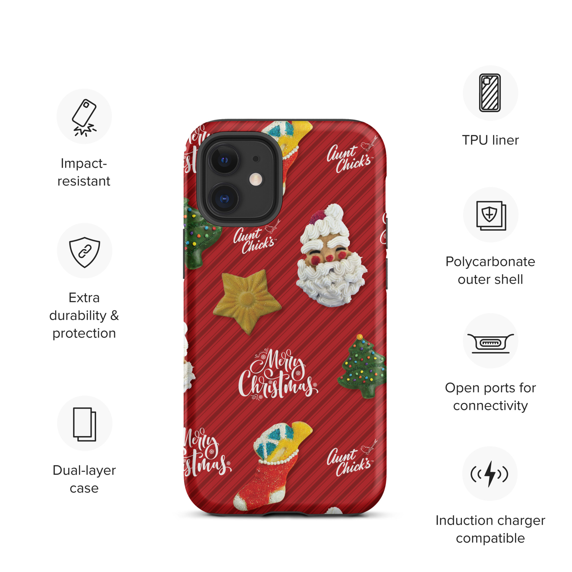 Introducing the iPhone® Tough Phone Case adorned with the festive charm of decorated Cookies crafted from Aunt Chick’s™ Merry Christmas Cookie Cutter Set. Embrace the holiday spirit with words of cheer and Aunt Chick’s™logo woven into a delightful red-striped holiday background, making every glance at your phone a celebration.