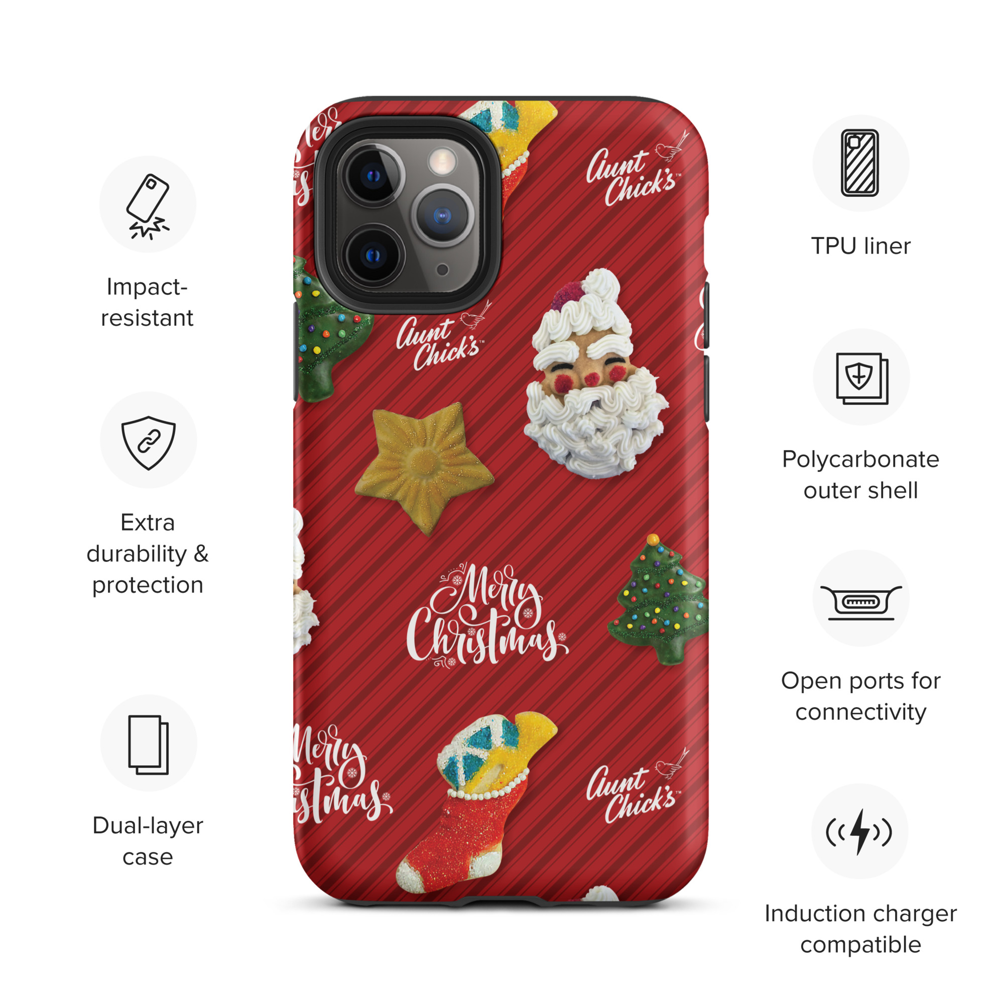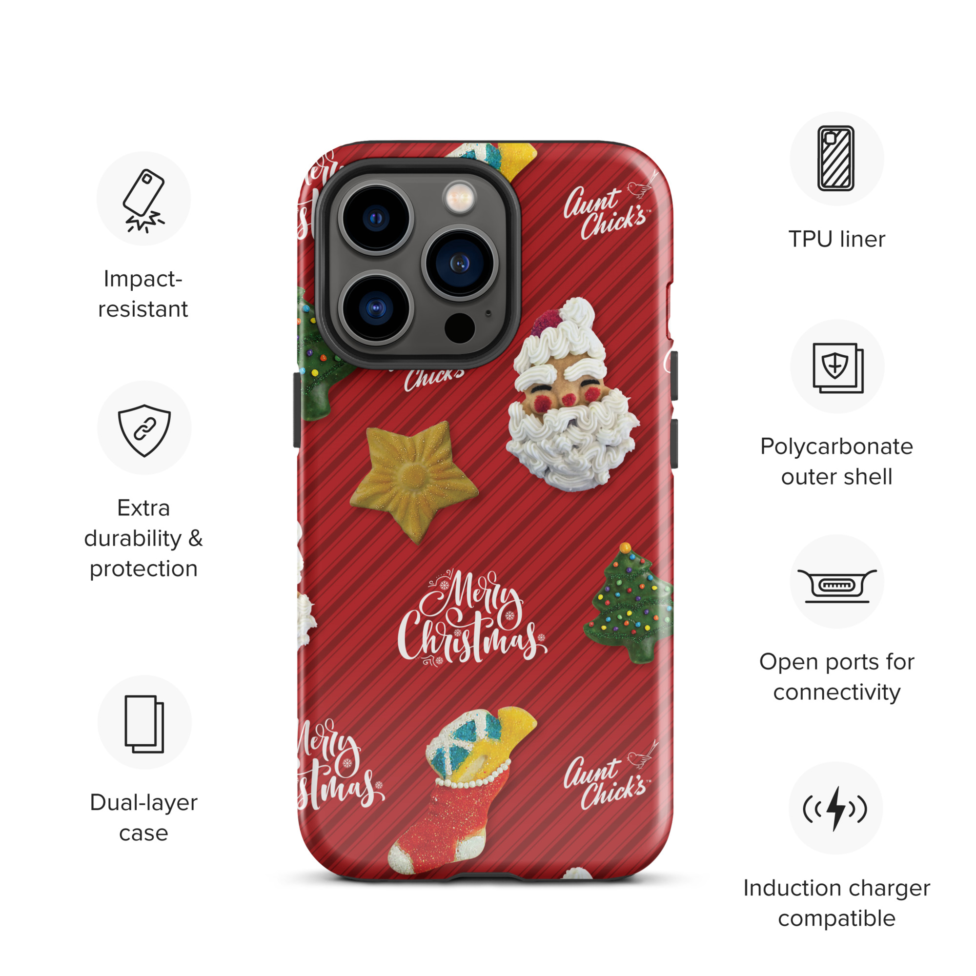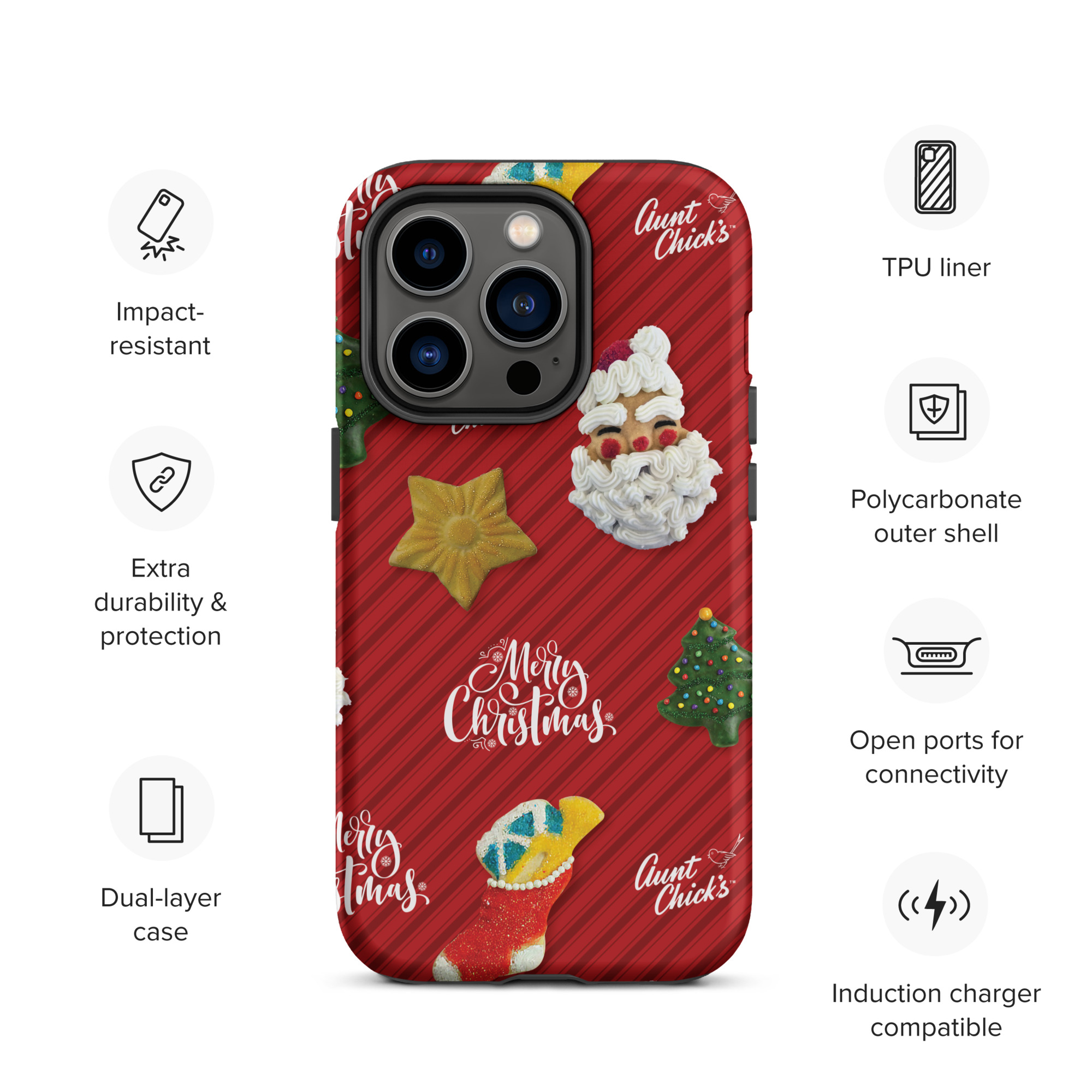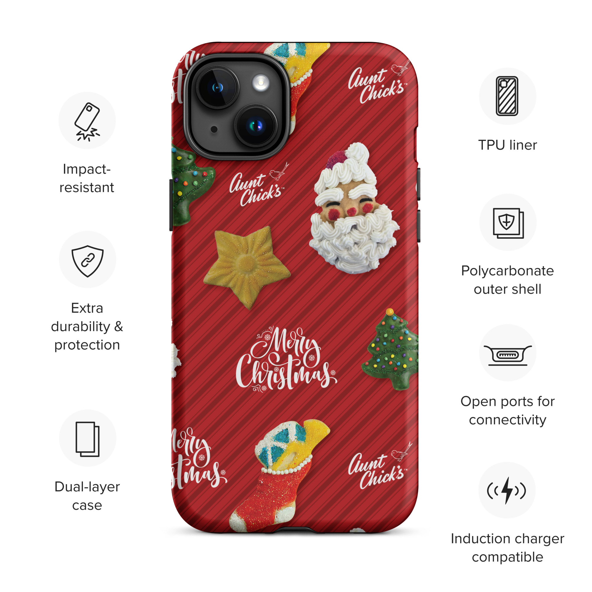 Introducing the iPhone® Tough Phone Case adorned with the festive charm of decorated Cookies crafted from Aunt Chick’s™ Merry Christmas Cookie Cutter Set. Embrace the holiday spirit with words of cheer and Aunt Chick’s™logo woven into a delightful red-striped holiday background, making every glance at your phone a celebration.