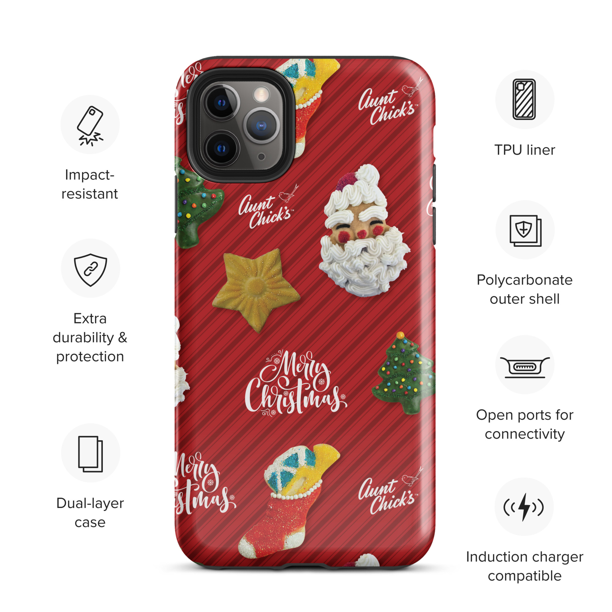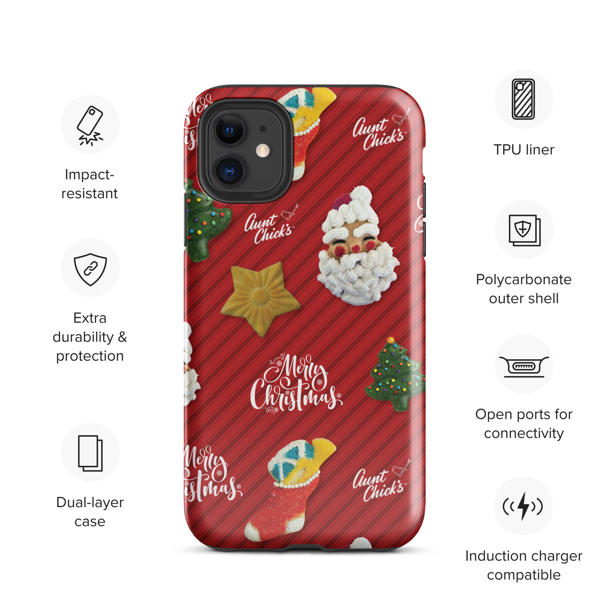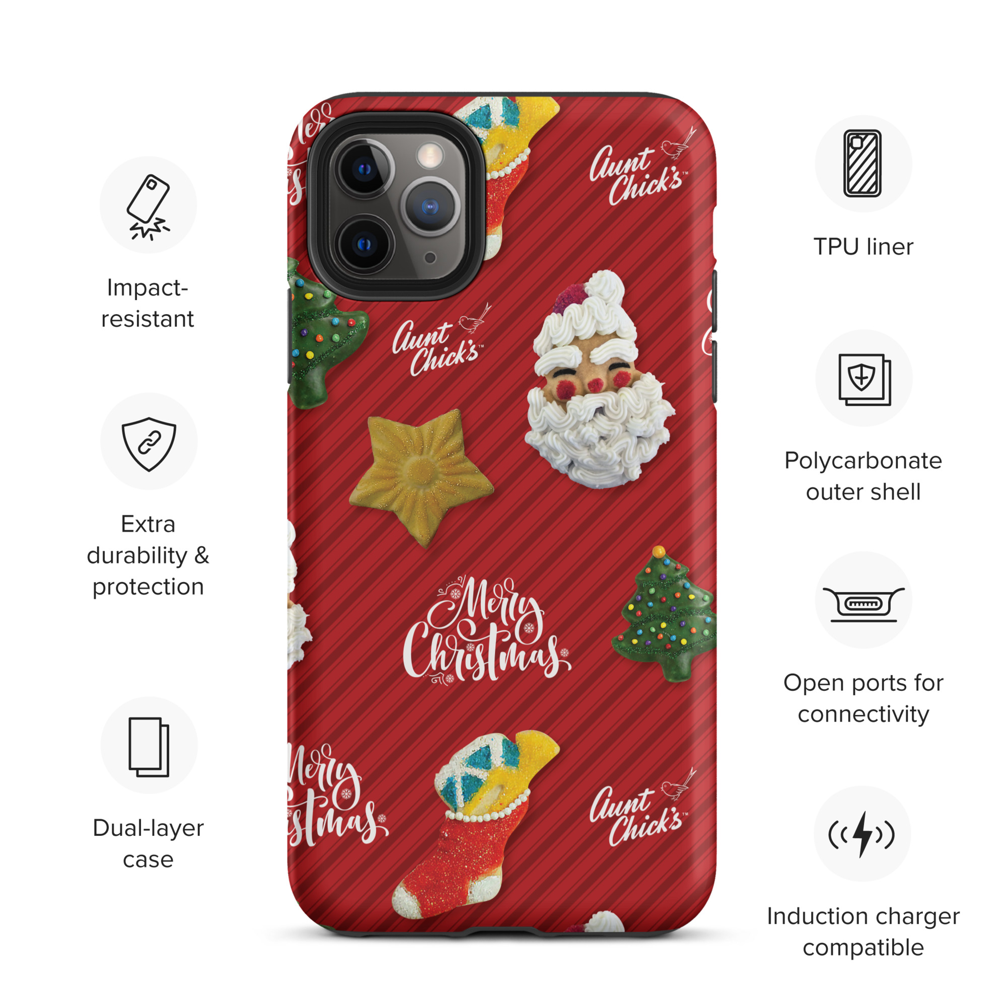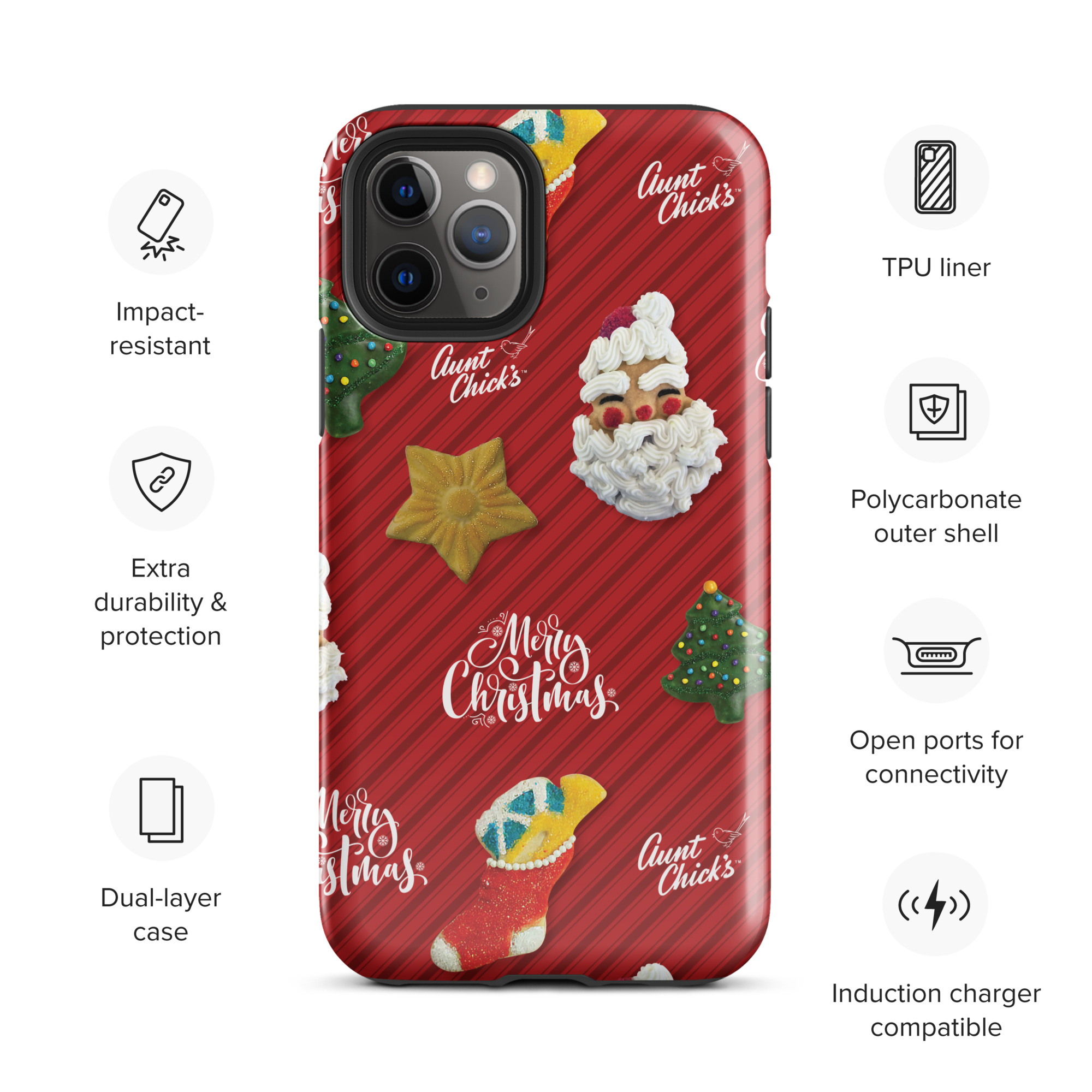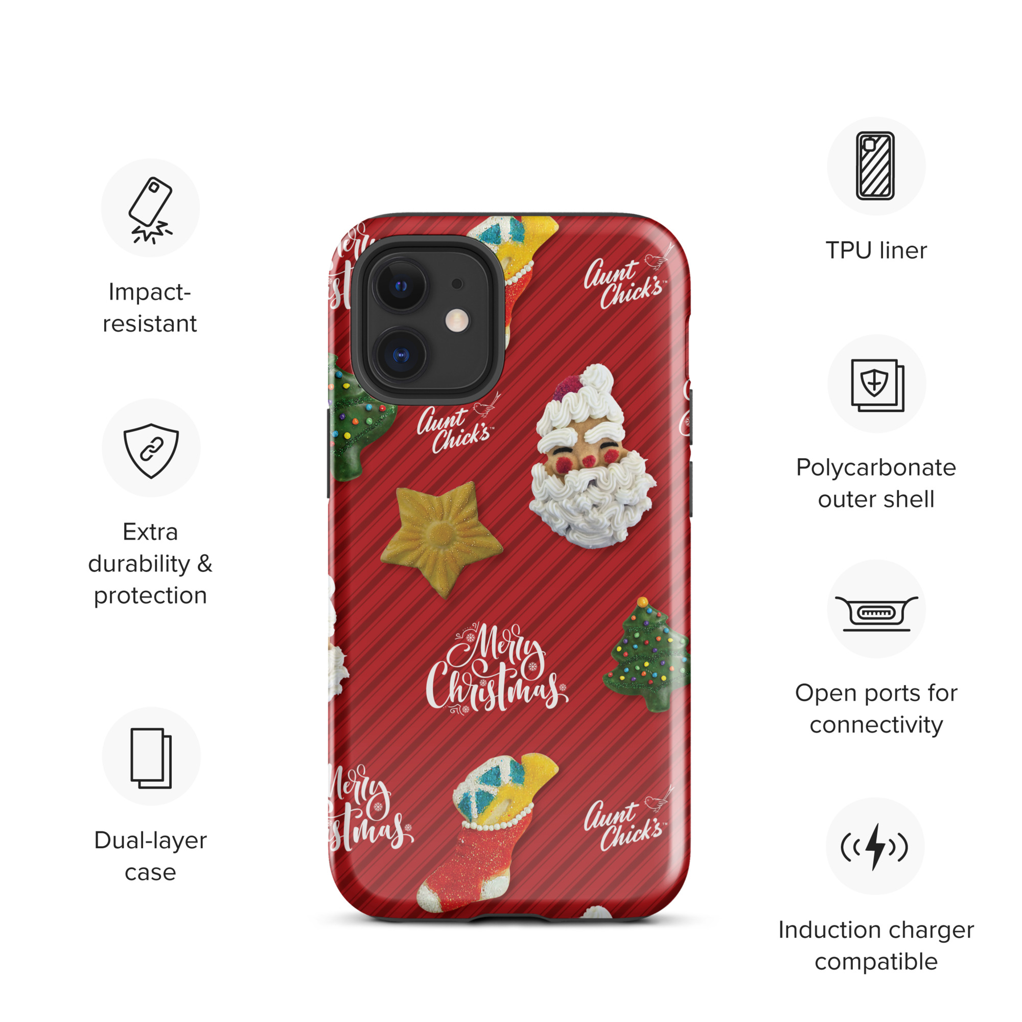 Introducing the iPhone® Tough Phone Case adorned with the festive charm of decorated Cookies crafted from Aunt Chick’s™ Merry Christmas Cookie Cutter Set. Embrace the holiday spirit with words of cheer and Aunt Chick’s™logo woven into a delightful red-striped holiday background, making every glance at your phone a celebration.