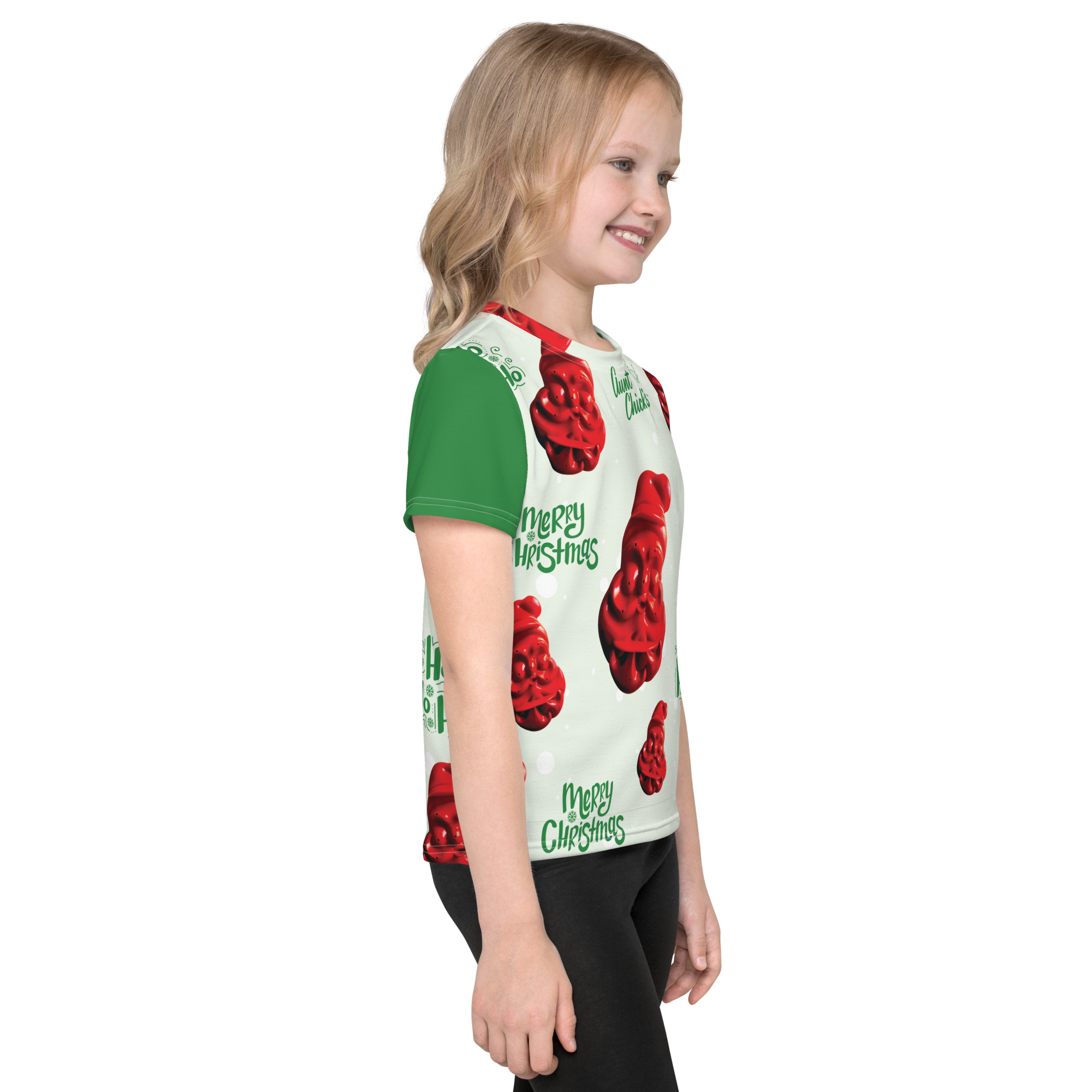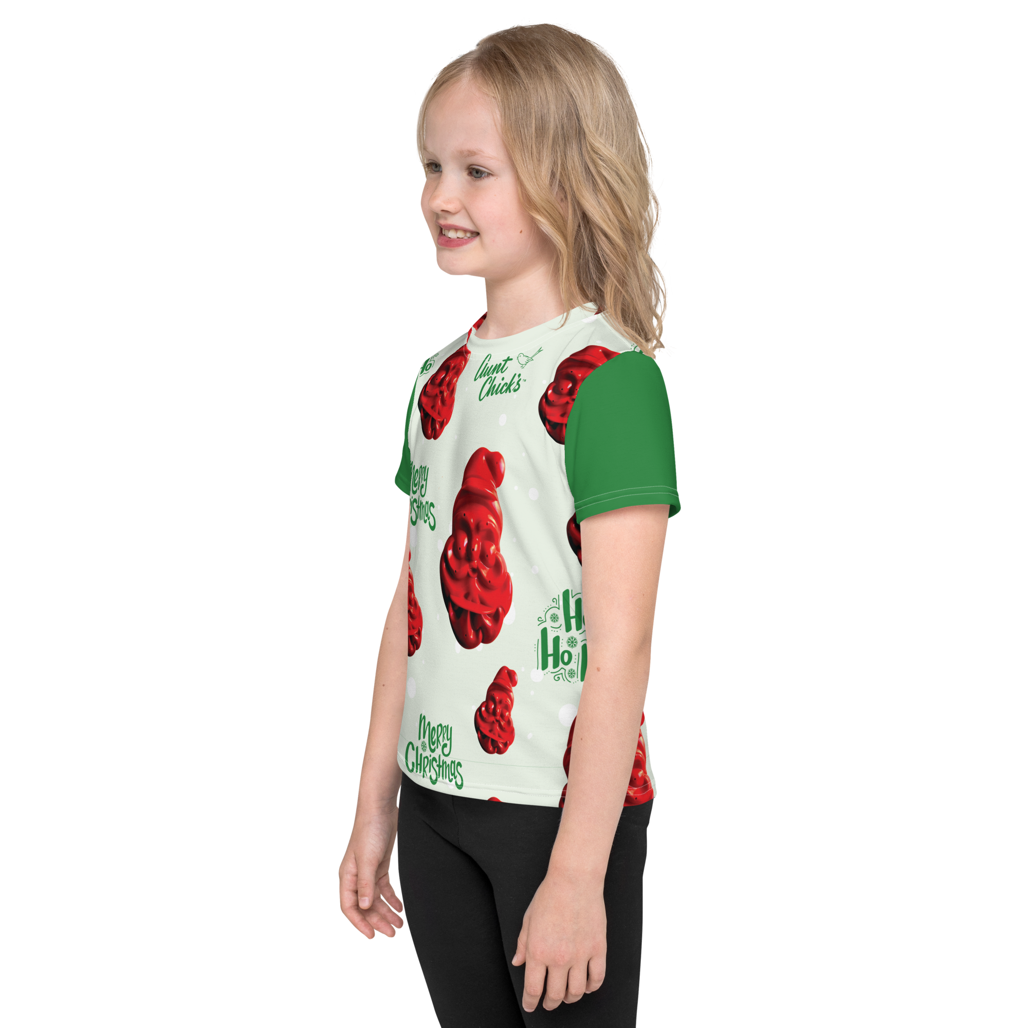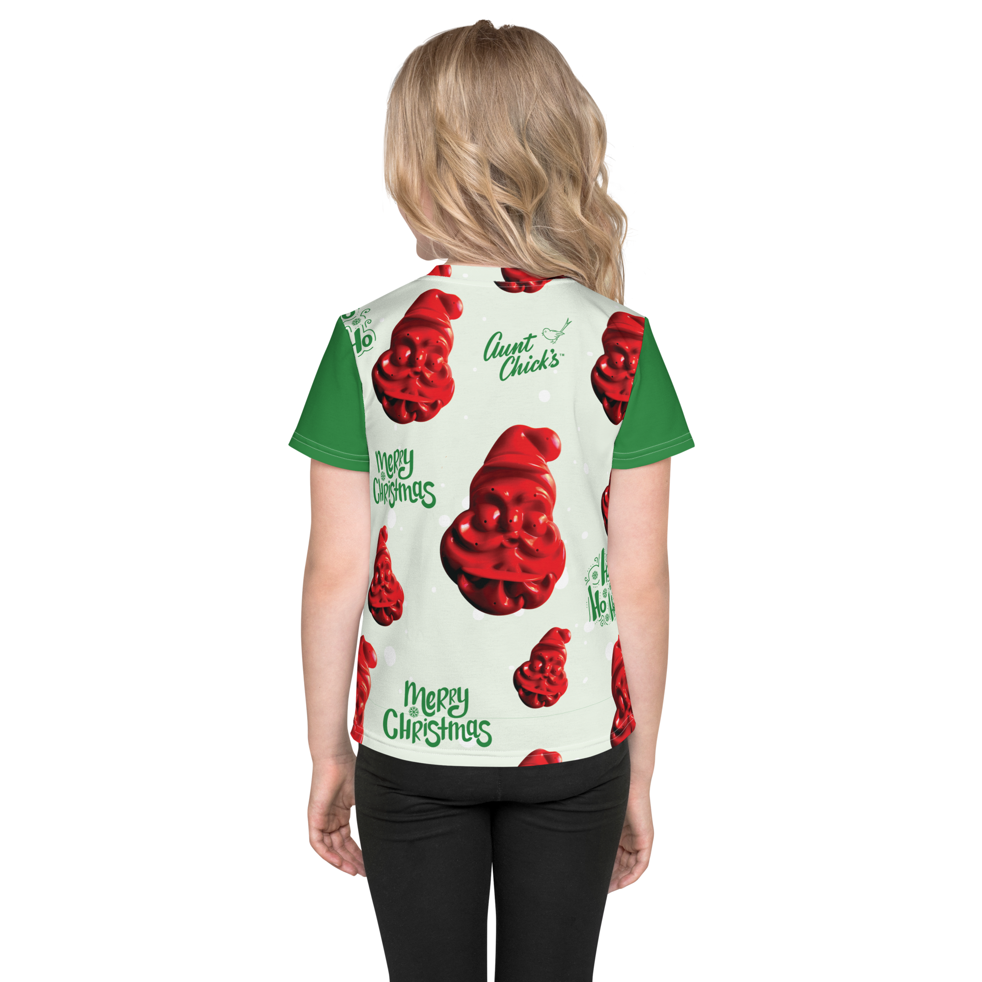 Introducing our Soft and Stretchy Kid’s Crew Neck T-Shirt, a playful tribute to holiday cheer and tradition. Featuring a whimsical pattern brimming with Aunt Chick’s™ Jolly Santa Cookie Cutter, festive words of “Ho-Ho-Ho” and “Merry Christmas,” and Aunt Chick’s™ logo, this shirt is an embodiment of joyful celebration. Crafted from soft and stretchy fabric, it ensures all-day comfort and flexibility for endless holiday adventures. Let your child revel in the magic of the season with this fun and festive t-shirt that captures the essence of cherished traditions and merry moments.