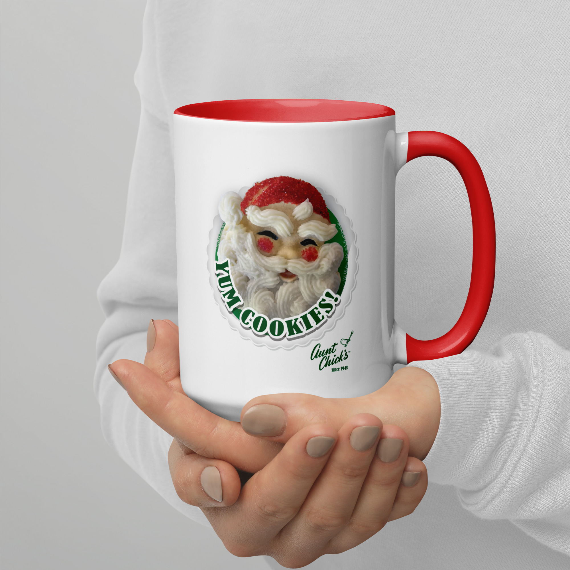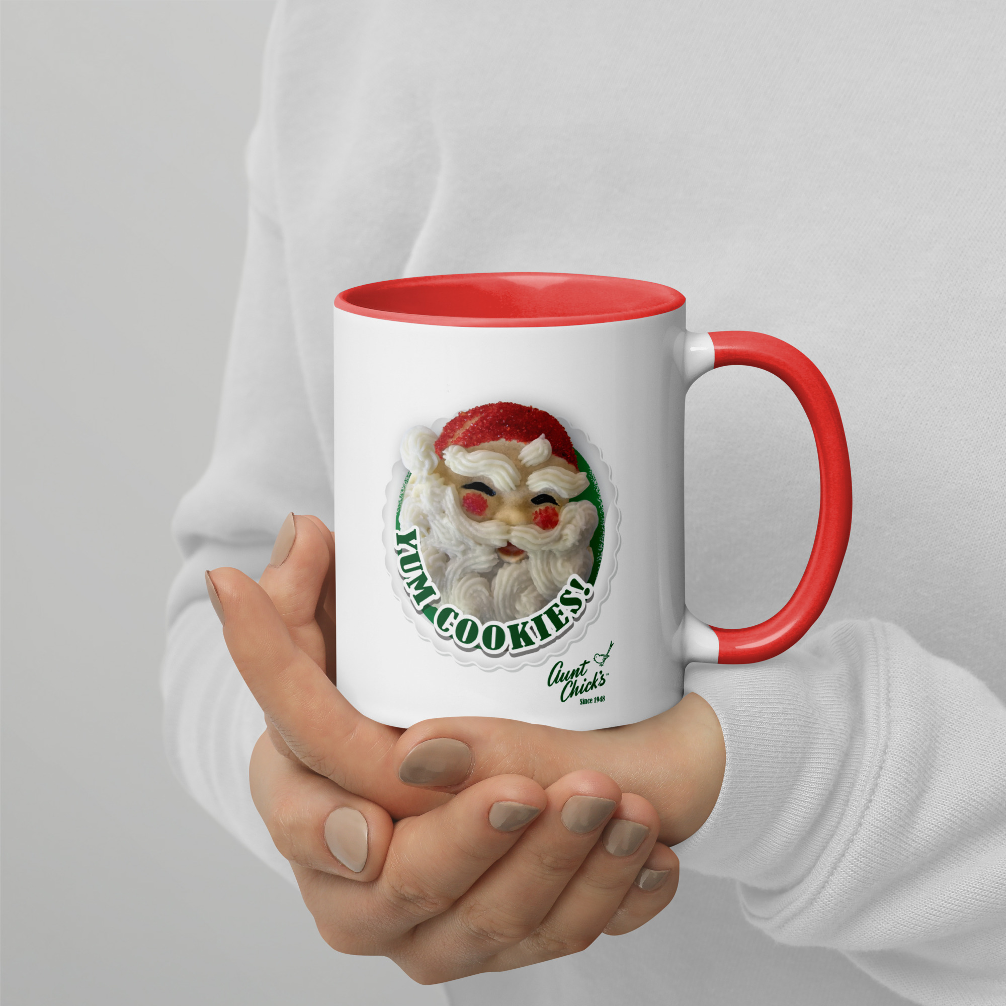 This festive ceramic mug showcases a delightful Santy Cookie crafted with the iconic Aunt Chick’s Santy Cookie Cutter. The whimsical design features the jolly cookie, perfectly capturing the holiday spirit. Bright and cheerful, the words “Yum Cookies!” are emblazoned in vibrant holiday colors, adding an extra touch of seasonal joy. This mug is part of the exclusive Aunt Chick’s “Yum Cookie” collection, one of four charming designs that celebrate the sweet tradition of holiday baking.