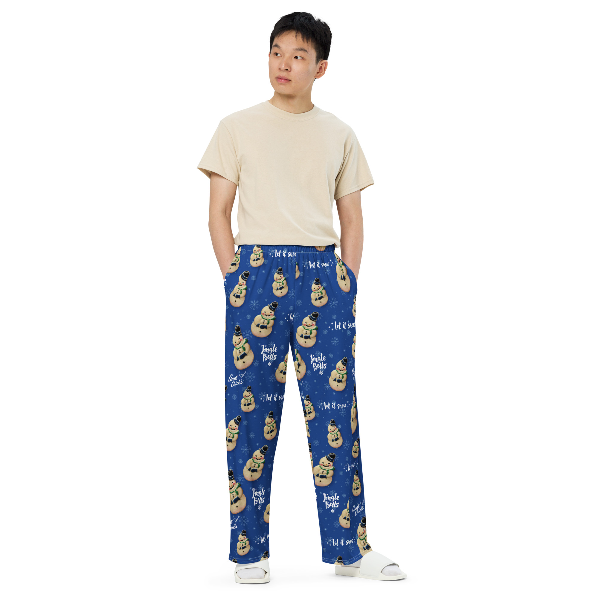 Introducing our Aunt Chick’s™ Snowman Cookie Motif Unisex Wide-Leg Pants, the epitome of festive style and comfort. These stretchy pants feature a captivating print adorned with Aunt Chick’s™ sweet Snowman Cookies made using the iconic Aunt Chick’s™ Snowman Cookie Cutter, interspersed with words of holiday cheer and Aunt Chick’s™ logo on a background filled with snowflakes.