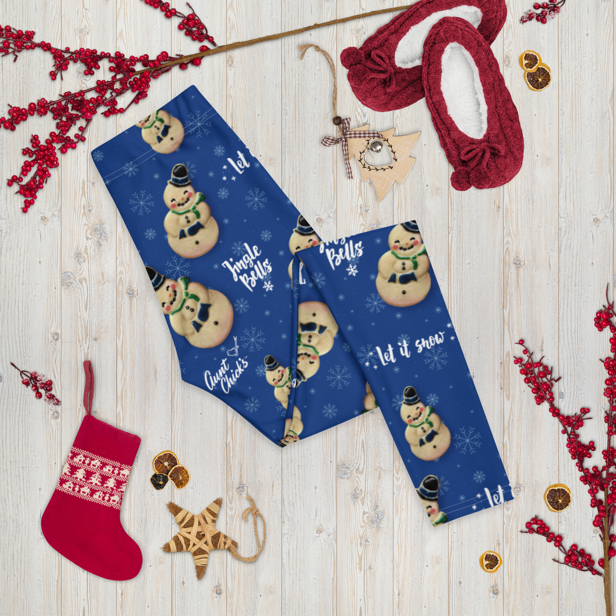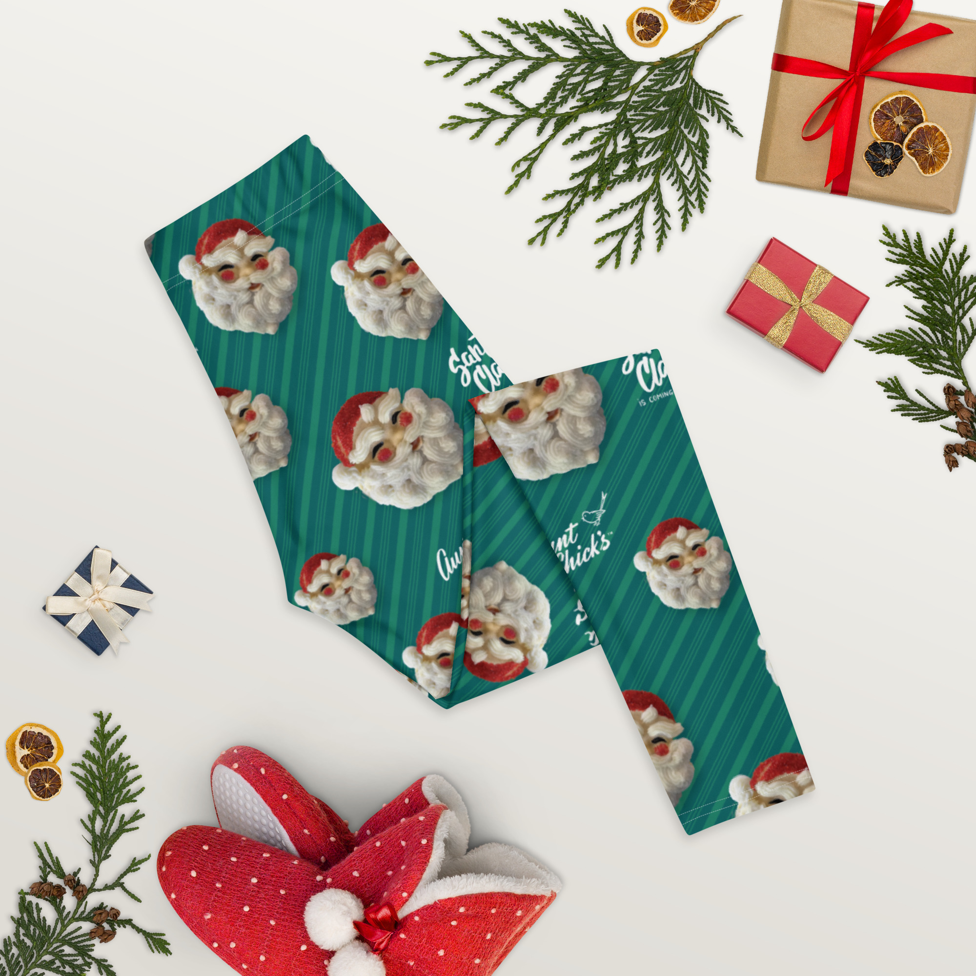 Get festive with our Aunt Chick’s Santy Cookie leggings! These charming leggings feature a delightful motif of Santy Cookies, Aunt Chick’s logo, and words of holiday cheer, all set against a cheerful green striped background.